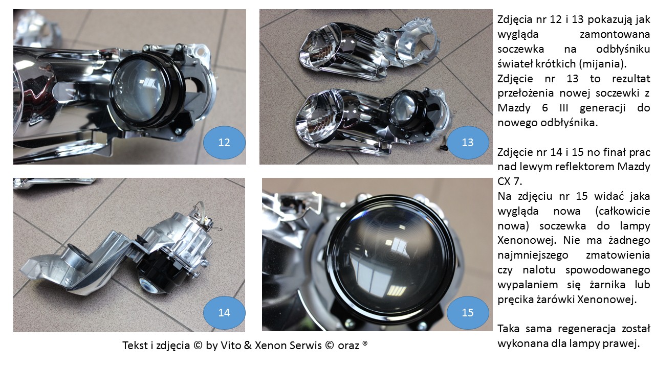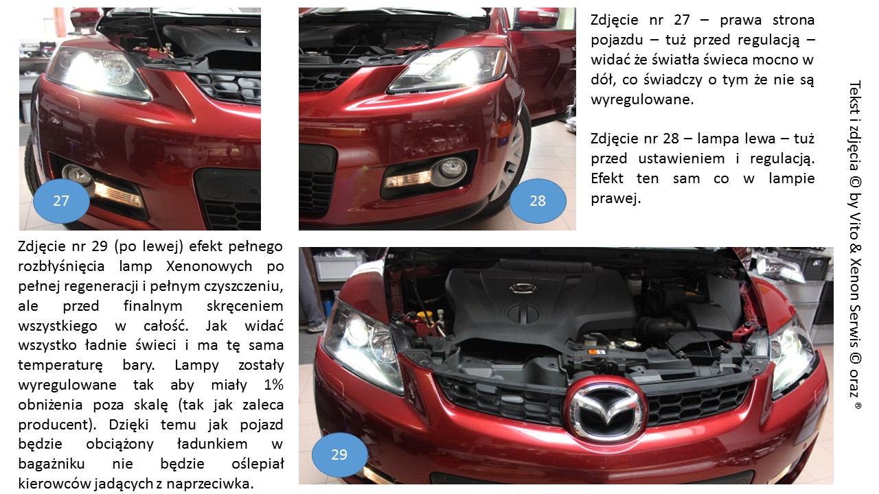 i dobrze że wymienił, tanio i sprawnie. Pytanie jest czy przy okazji szybkiej wymiany dokonał odpowiedniej regulacji? Jak wiemy Xenon ne ma regulacji ręcznej lecz ma regulację automatyczną, ale i tę automatyczną należny zawsze po każdej wymianie sprawdzić i jak coś jest poza zakresem określonym przez producenta, to należy to wyregulować. Oczywistą rzeczą jest, że każda automatyka działa w pewnym zakresie i ten zakres musi być prawidłowy inaczej będzie się świecić wiązką światła innym kierowcą po oczach ze względu na nieprawidłowe ustawienie świateł. Na każdej lampie są oznaczenia jaka jest wymagana konfiguracja w odległości metra od lampy i jakie jest dopuszczalne odchylenie. Na kloszu reflektora są naniesione punkty do których należny odnieść pomiar. W ten sposób dokonuje się regulacji, a dobrze ustawiona wiązka światła i prawidłowe ich świecenie wpływa na bezpieczeństwo zarówno nasze jak i innych kierowców. Wymiana to jedno, ustawienie wiązki światła to drugie a regulacja to jeszcze co innego. Dlatego mój wątek pokazuje całość jak to powinno być prawidłowo zrobione. Przy okazji zregenerowałem i wyczyściłem klosze oraz wstawiłem nowe soczewki bo z upływem czasu się wypalają i nic nie da nowa żarówka z super żarnikiem bo soczewka będzie po prostu działała jak siatka dyfrakcyjna zamiast skupiać wiązkę światła to będzie ją rozpraszać o oślepiać innych.