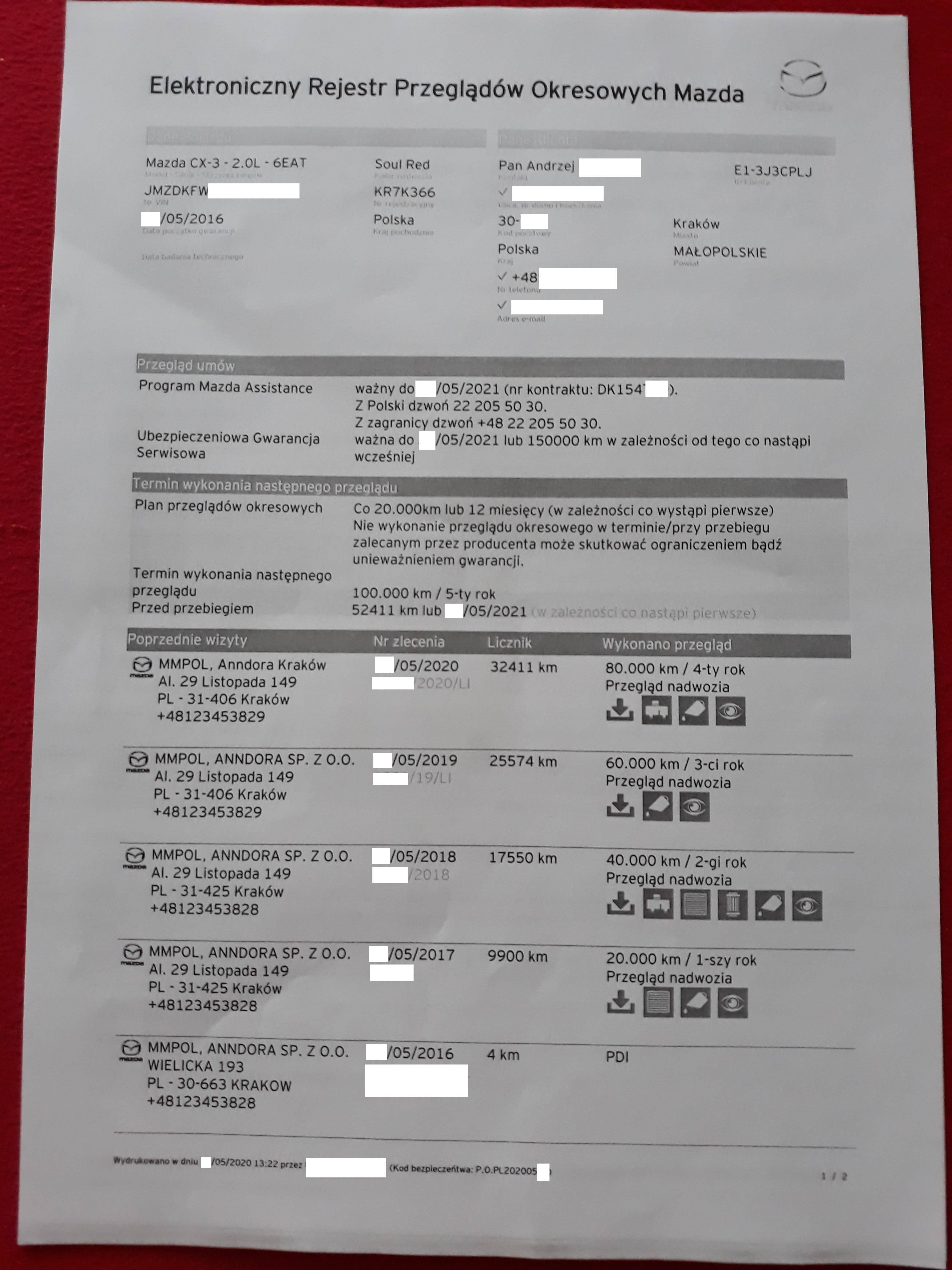 Samochodzik odstawiony i przyjęty na przegląd punktualnie o umówionej godzinie Anndora KRK. – przebieg 32 411 , niestety ze względu na utrudnienia z powodu Covid19 nie dało się powymieniać uwag i podpytać o różne sprawy na temat autka jak w zeszłym roku