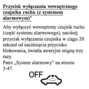 1. Przy systemie aktywnego kluczyka, w jaki sposób zamknąć drzwi i pozostawić wyłączony alarm? Chodzi o sytuację typu zostawienie psa / pasażerów w samochodzie i wyjście z niego (na przykład stacja benzynowa). Instrukcja wspomina o naciśnięciu przycisku wyłączenia czujnika ruchu... Ale gdzie? Na pilocie? W samochodzie?