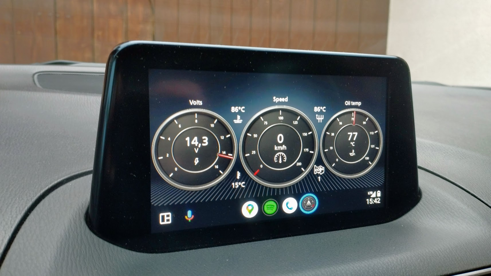Mam obecnie na dużych zegarach ładowanie, prędkość oraz temperaturę oleju w silniku, a wokół centralnego zegara dodatkowo temp w dolocie, temp cieczy chłodzącej, temp oleju w skrzyni i aktualny bieg (w automacie brakuje mi tego w fabrycznym liczniku Mazdy, szkoda że obok literki D nie ma małej cyferki z biegiem, ale ten patent rozwiązuje problem