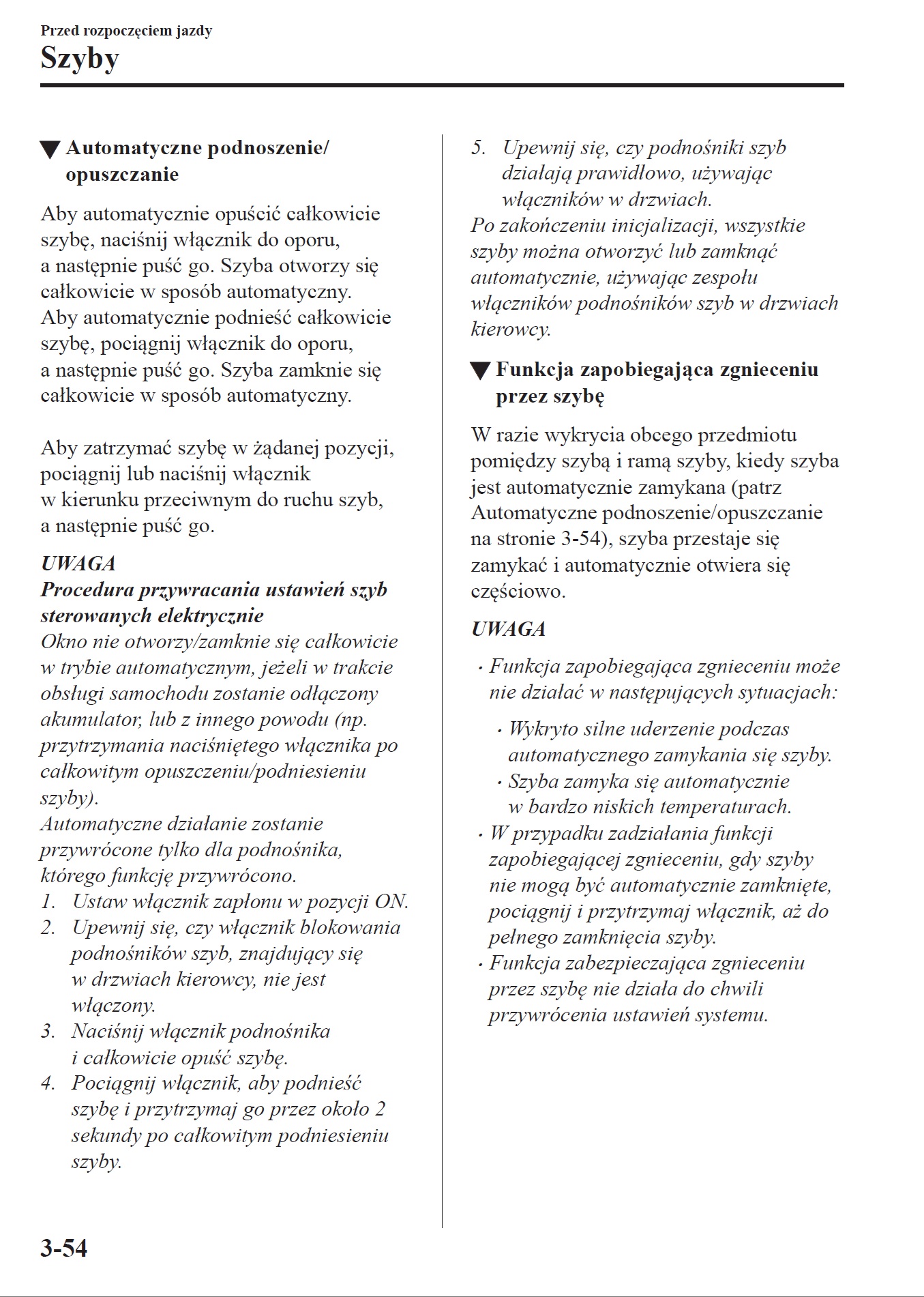 To już taka „uroda” automatycznego podnoszenia/opuszczania szyb, chyba w większości współczesnych samochodów. Trzeba „nauczyć" na nowo komputer końcowych pozycji szyby. W załączniku masz to opisane. A w Twojej CX-5 szyba mogła po prostu przymarznąć.