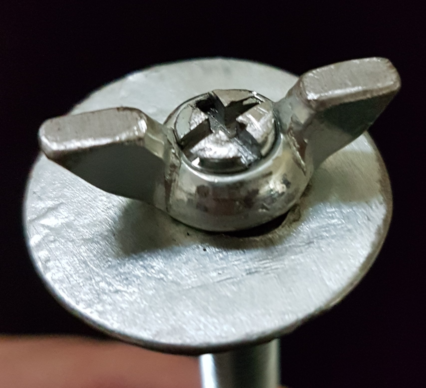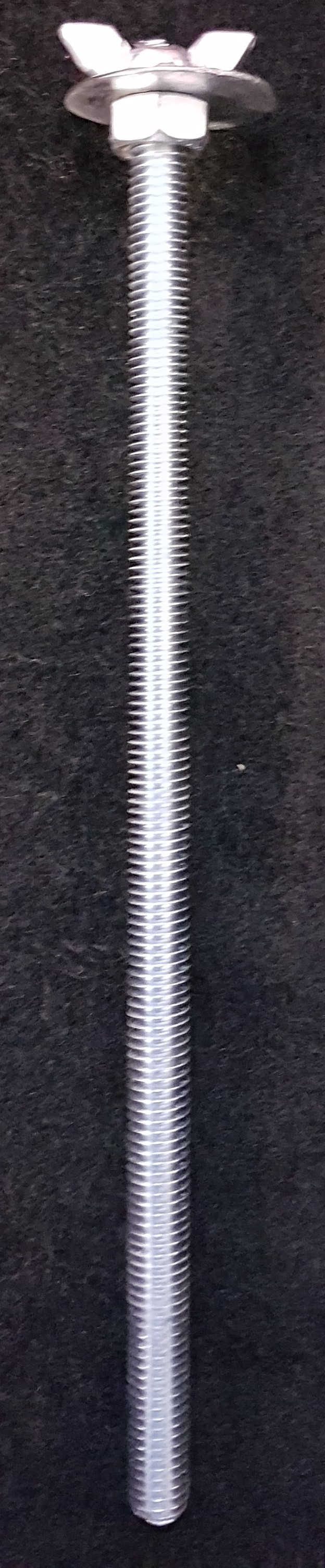 -nowa śruba mocująca została wykonana z pręta gwintowanego M8 o długości 18,8cm. Pręt na końcu został nacięty na krzyż i zakończony nakrętką M8 , podkładka średnica 3cm z otworem fi8 ,i na samą górę motylek M8 o wysokości 8mm całość ze sobą sklejona na klej do gwintów (zielony).