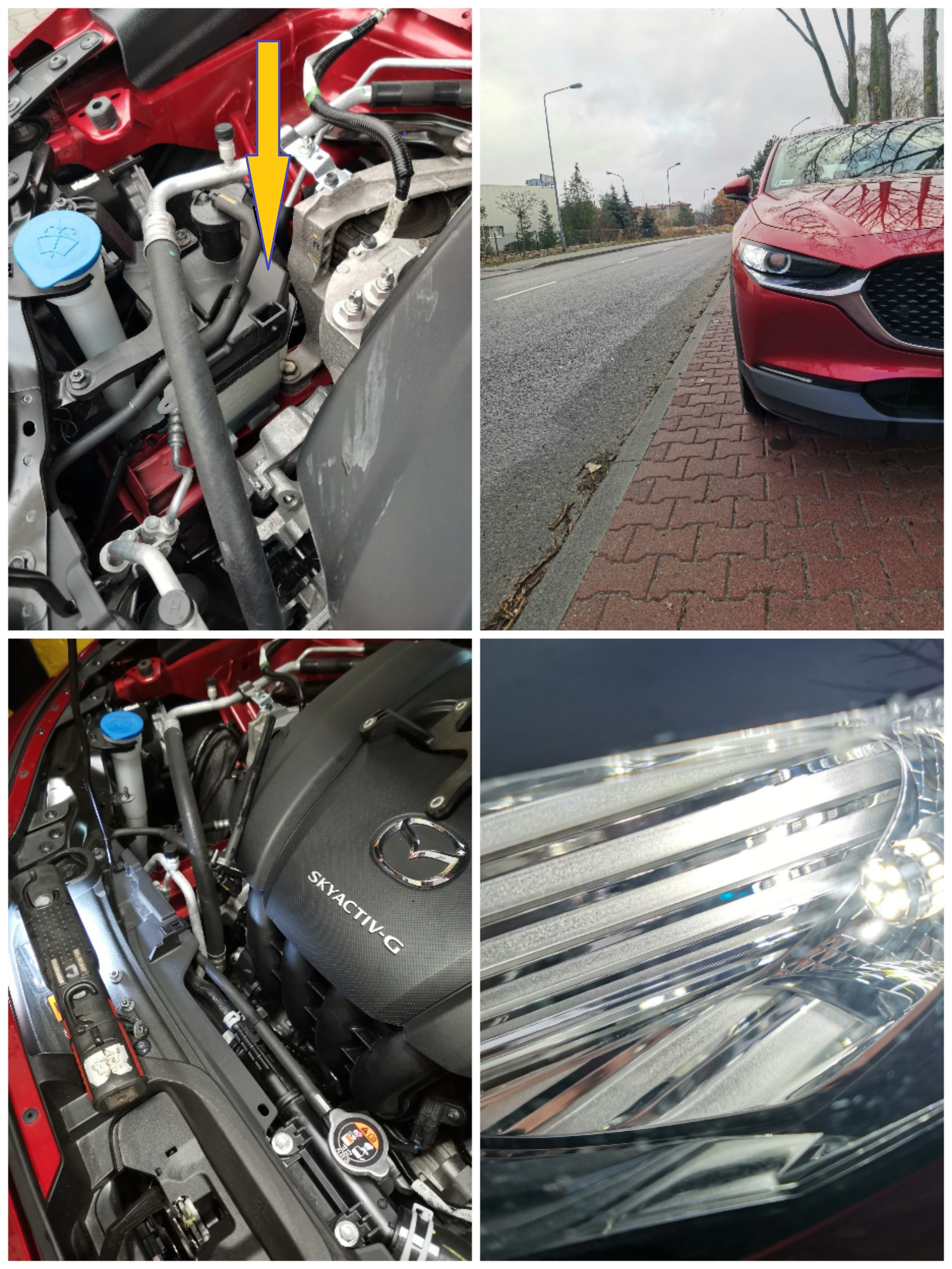 Z lewej strony wymiana żarówki poszła bezproblemowo (trzeba trochę ponurkować dłonią). Z prawej strony był problem (bardzo mało miejsca), ale poradziłem sobie w ten sposób, że zdemontowałem zbiorniczek nadmiarowy płynu chłodniczego (patrz zaznaczenie), a nie tak jak sugerują inni poprzez rozpięcie nadkola plastikowego. Cała operacja wymiany żarówek trwała 10 minut.