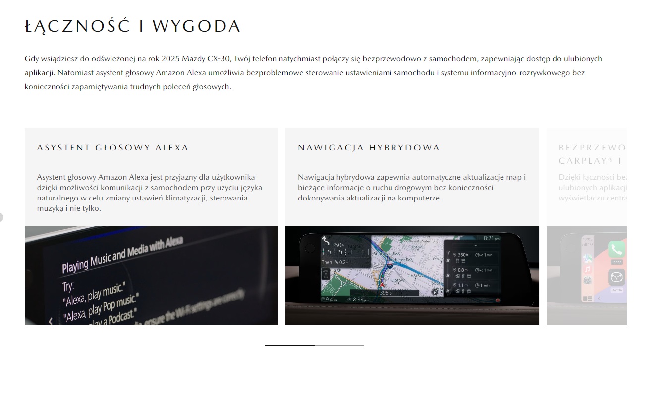 Dzisiaj otrzymałem info od dilera że moja cx-30 zostanie dostarczona z dwu miesięcznym opóźnieniem (zamawiałem 2 lutego a odbiór miał być do 1 lipca), zadałem pytanie dlaczego jest takie przesunięcie czasowe i uzyskałem info że były problemy z dostawami nowych podzespołów do produkcji samochodów ale teraz cx-30 będą miały aktualizacje online (aktualizacje map, i ma być poprawiona i rozbudowana fabryczna komunikacja głosowa). Moja Madzia będzie produkowana 17.06.2024 – no cóż poczekamy ,zobaczymy. Dostałem taki link jak to ma wyglądać :