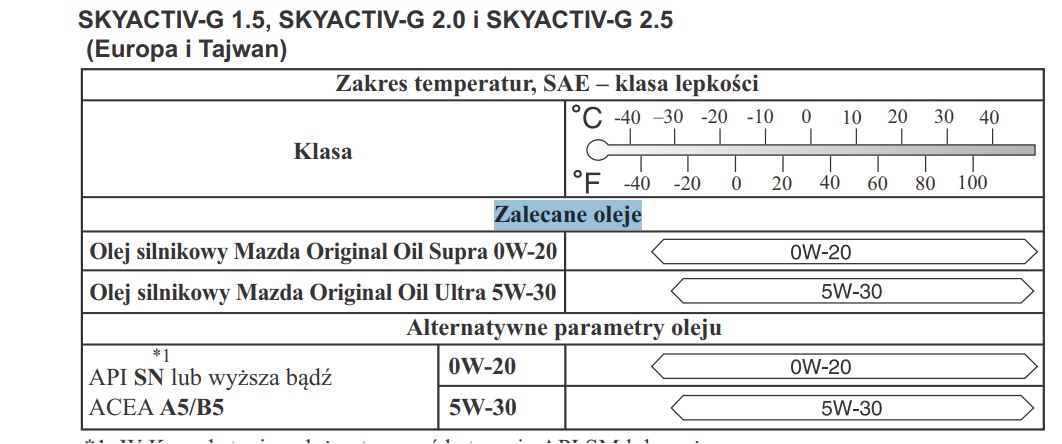 Mazda Supra Skyactiv 0W20 5L paradoksalnie Mazdy najdroższy, ktoś coś się wypowie? Z racji niskich przebiegów wymieniam olej raz do roku auto jeździ w większości po mieście. Wrzucam przy okazji info z instrukcji