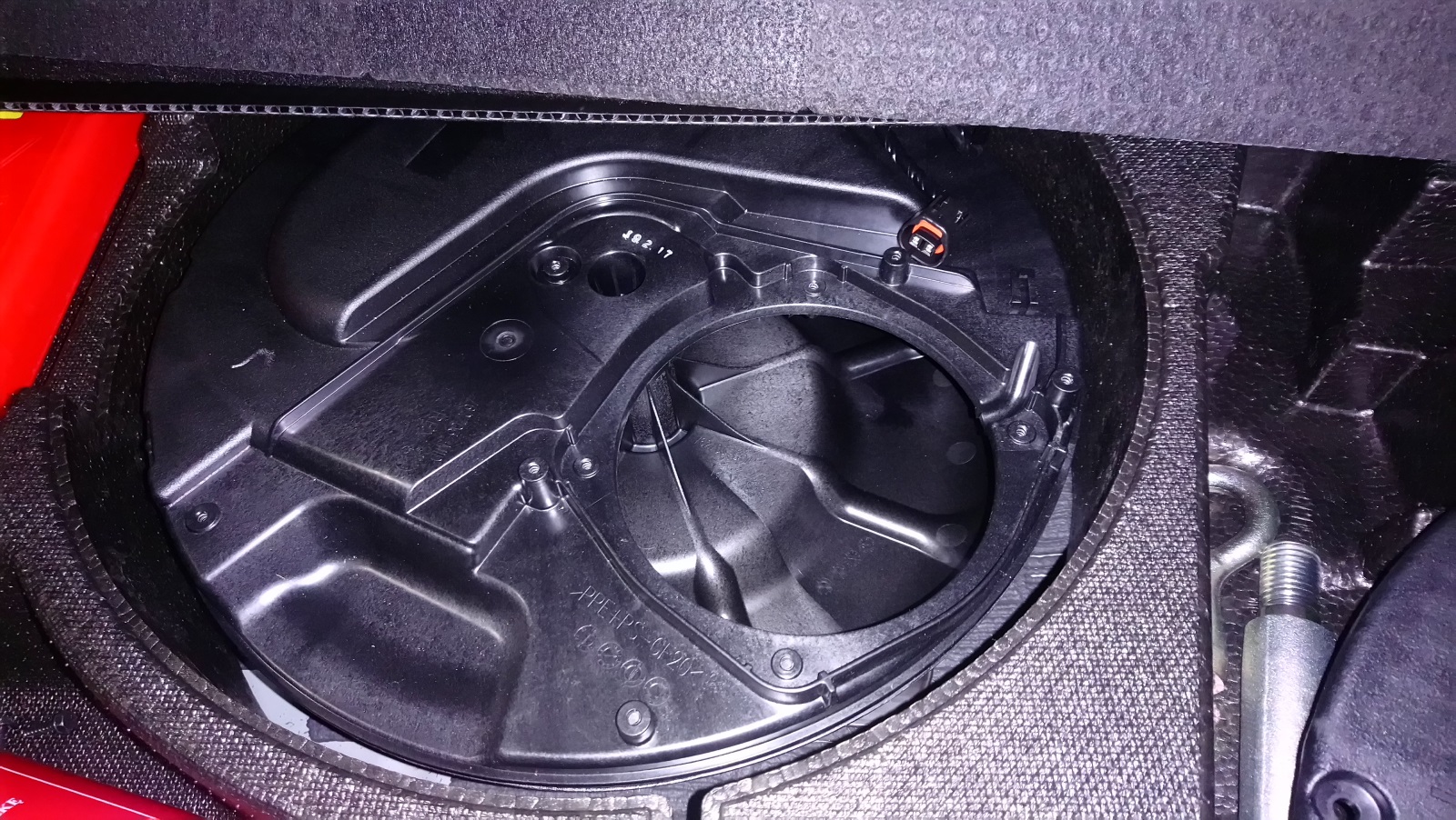 Wymontowany od siebie. Ten sub pracuje w zamkniętej, aczkolwiek od przodu ma osłonę. Pierwotnie myślałem że jest to BandPass 4th jednak ta osłona nie jest zamkniętą przestrzenią, tylko ma osłaniać przed uszkodzeniami. Zwróć uwagę na wycięcia w narożnikach głośnika którymi ma przechodzić powietrze i dzięki temu minimalizować opory powietrza.