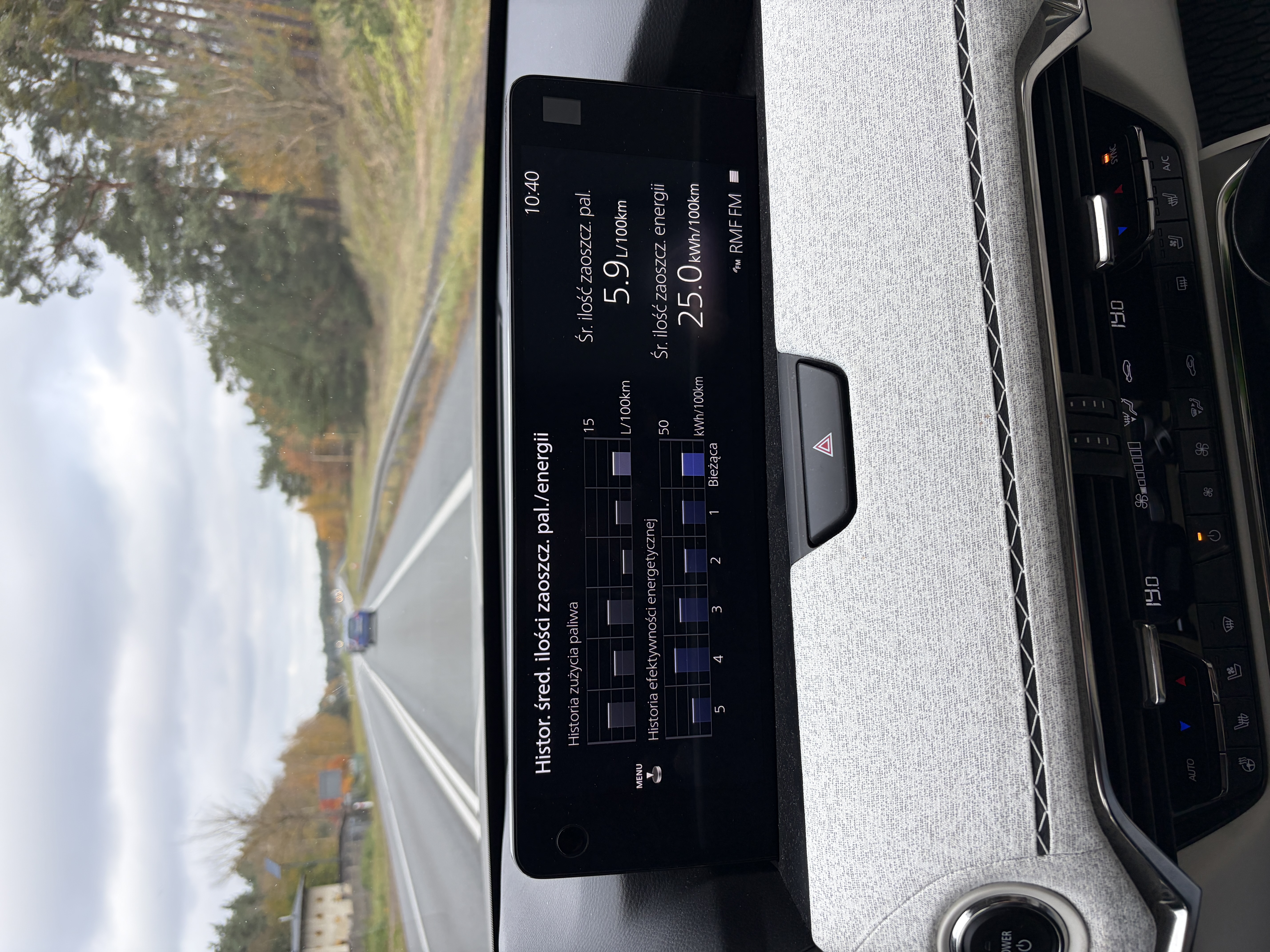 W każdym razie. Gdy ostatnio jeździłem po okolicy, samochód przełączał się na napęd spalinowy już przy około 20% stanu baterii (dlatego właśnie szukałem tej opcji ustawień). Teraz, w trasie, schodził nawet do 6%.