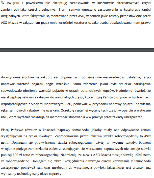 Ubezpieczyciel już określił, gdzie leży interes poszkodowanego i jego odwołania. Chcesz to pisz kolejne. Ja Ci napisałem już w poście z 08 stycznia " Jeśli masz zastrzeżenia do rzetelności wyceny, wtedy dopiero możesz zlecić wycenę niezależnemu rzeczoznawcy, lub warsztatowi, który dokona naprawy w oparciu o własny kosztorys. Taki kosztorys też musi być zaakceptowany przez ubezpieczyciela. Do oględzin powinieneś zrzucić zderzak (pod skorupą znajdziesz dodatkowe uszkodzenia (wzmocnienia, zaczepy, ślizgi). Kosztem pracy mechanika można obciążyć ubezpieczyciela, bo ujawnienie tych uszkodzeń nie jest możliwe bez zdemontowania zderzaka. Sądzę, że wartość tej szkody przekroczy 5 tys zł"