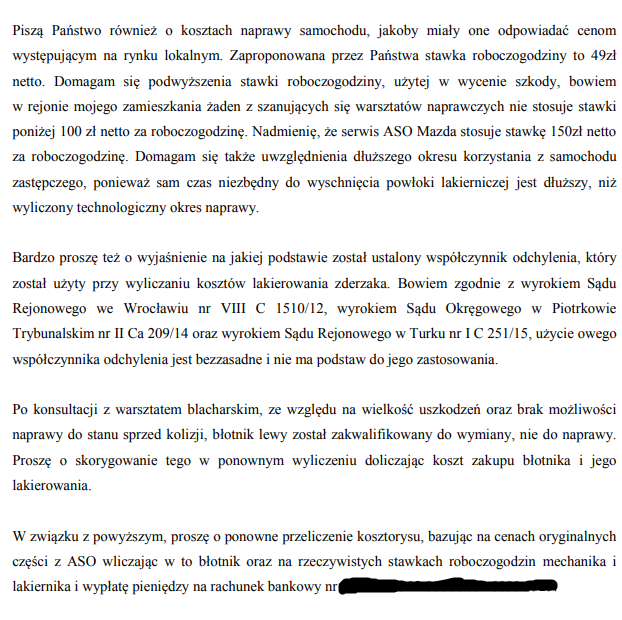 Brak wskazania nr konta spowodował, że ubezpieczyciel nie miał gdzie przelać kwoty odszkodowania, tym samym przedłużył się proces likwidacji szkody, a ubezpieczyciel dostał argument usprawiedliwiający niedotrzymanie ustawowych terminów.