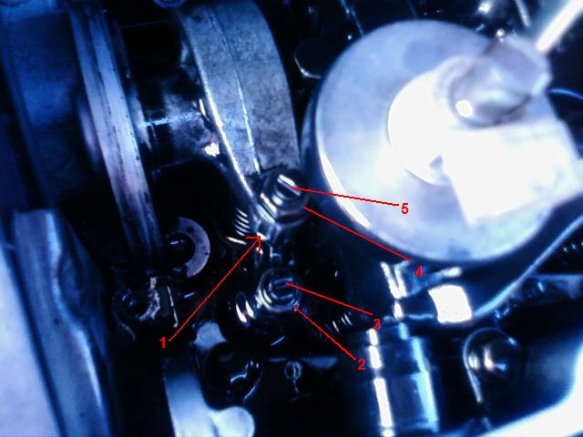 2. Sprawdzamy luzy w 1,2,4 i 5 parze zaworów. Luz kontrolujemy we wskazanym miejscu (1), dla zaworów ssących luz powinien być 0.12-0.18mm a dla wydechowych 0.32-0.38mm.