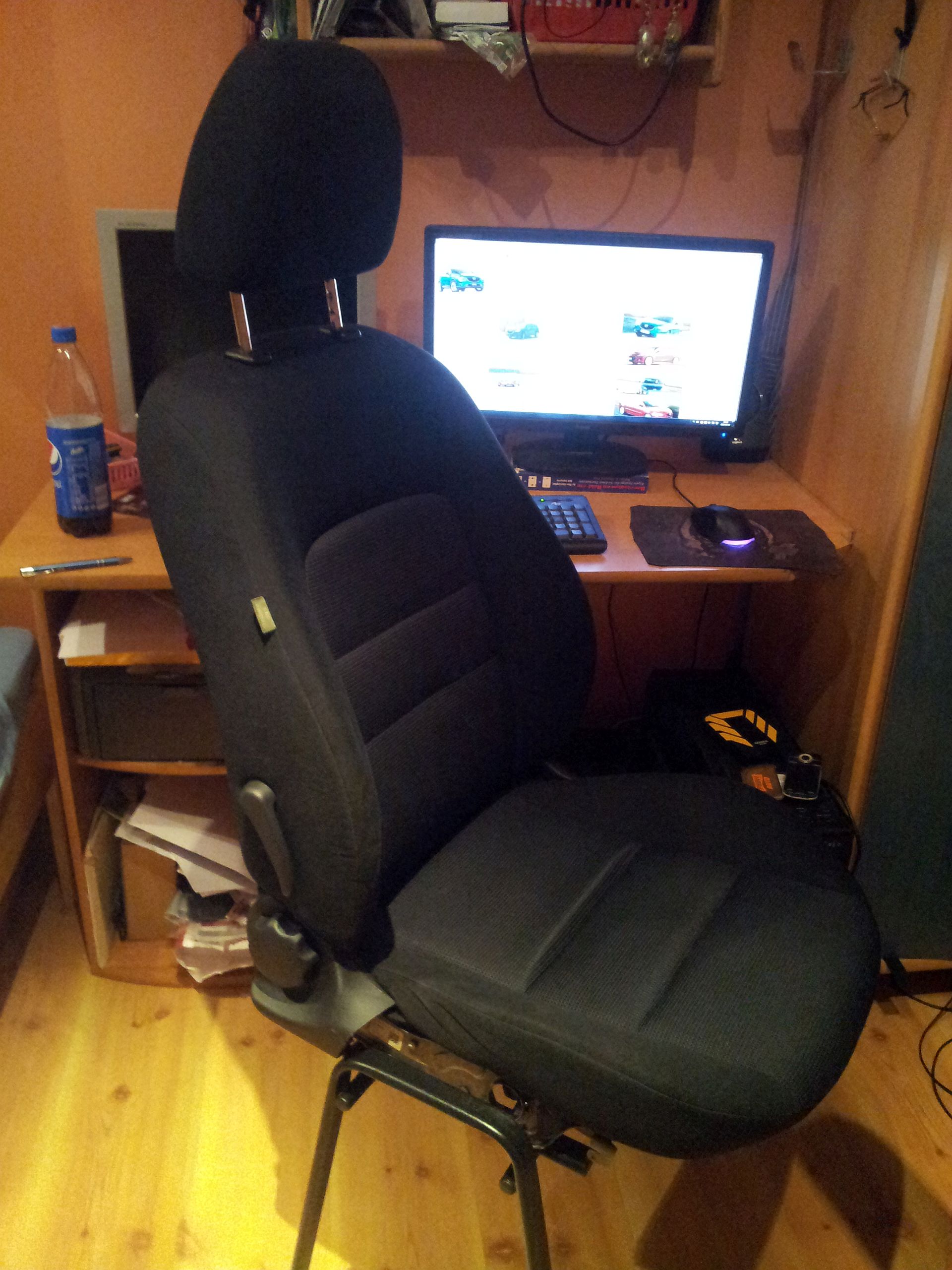 może i śmieszne może i zabawne ale za to moje diy – fotel z angola 50zł (m6 jak widać) stelaż miałem bo 2 dni wcześniej od mojego bujania się popsułem krzesło "Konferencyjne – ISO" czy jak kto tam woli niestety nie miałem fotela obracanego aby coś ładniejszego wyszło plastiki też musiałem pociąć nie chciało mi się bawić w rzeźbienie są lepsze fotele do takiej zabawy ale taki miałem praktycznie pod domem