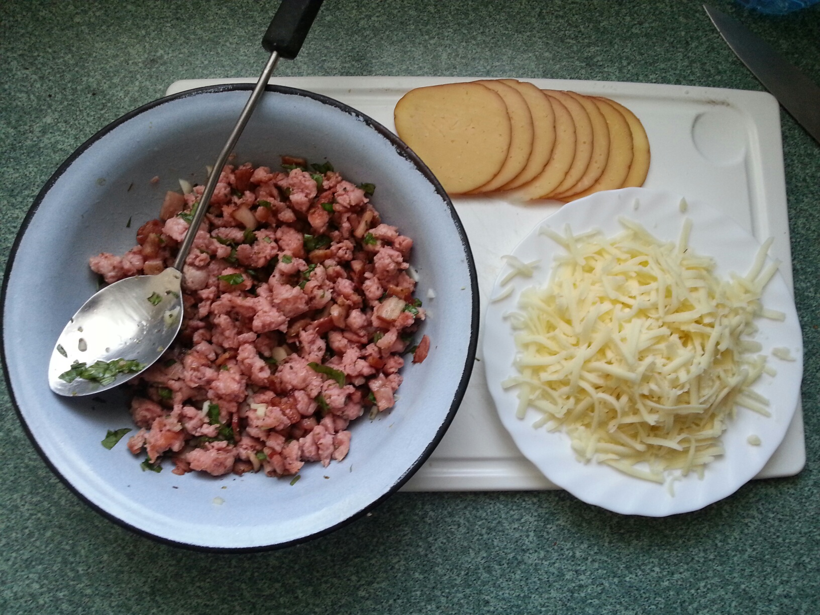 Ser mozzarella starty, wędzony w plastrach czeka na swoją kolej.