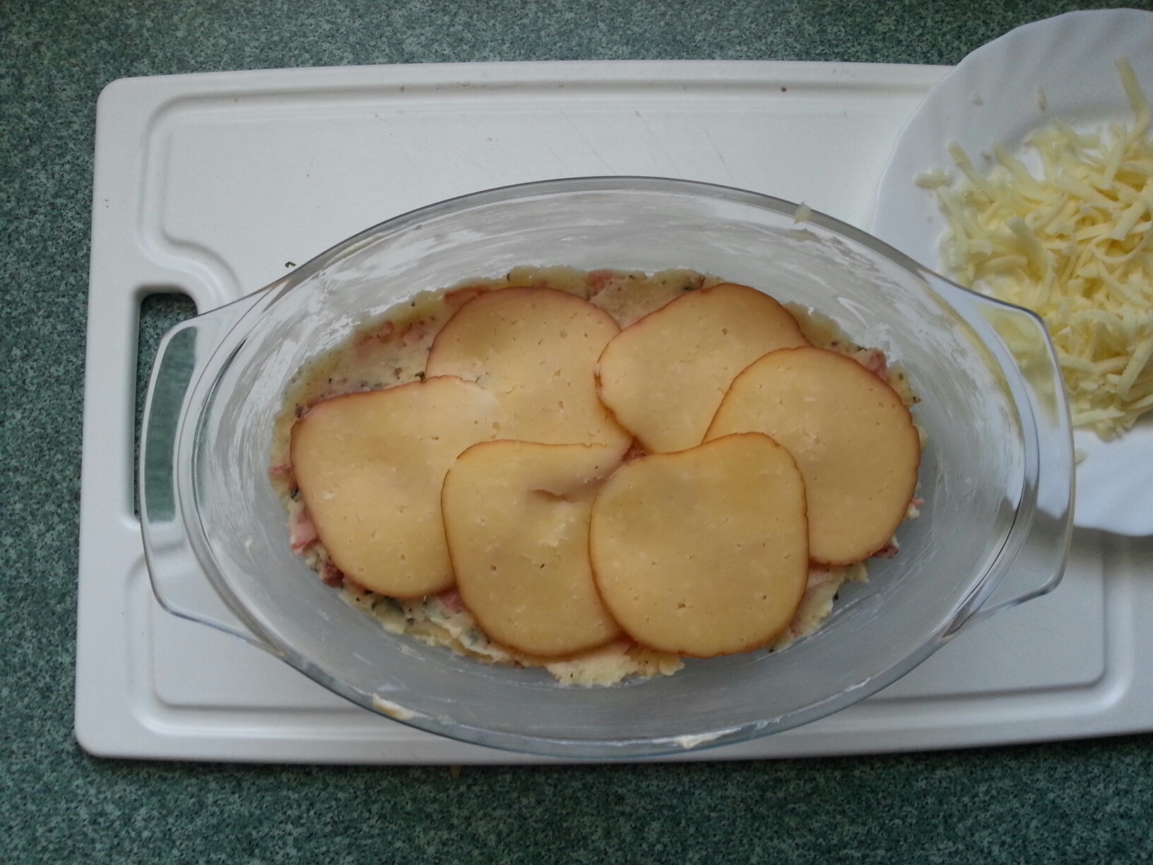 Przekładam w połowie serem wędzonym, druga warstwa, reszta sera mozarelli na wierzch i posypuję delikatnie bułką tartą.