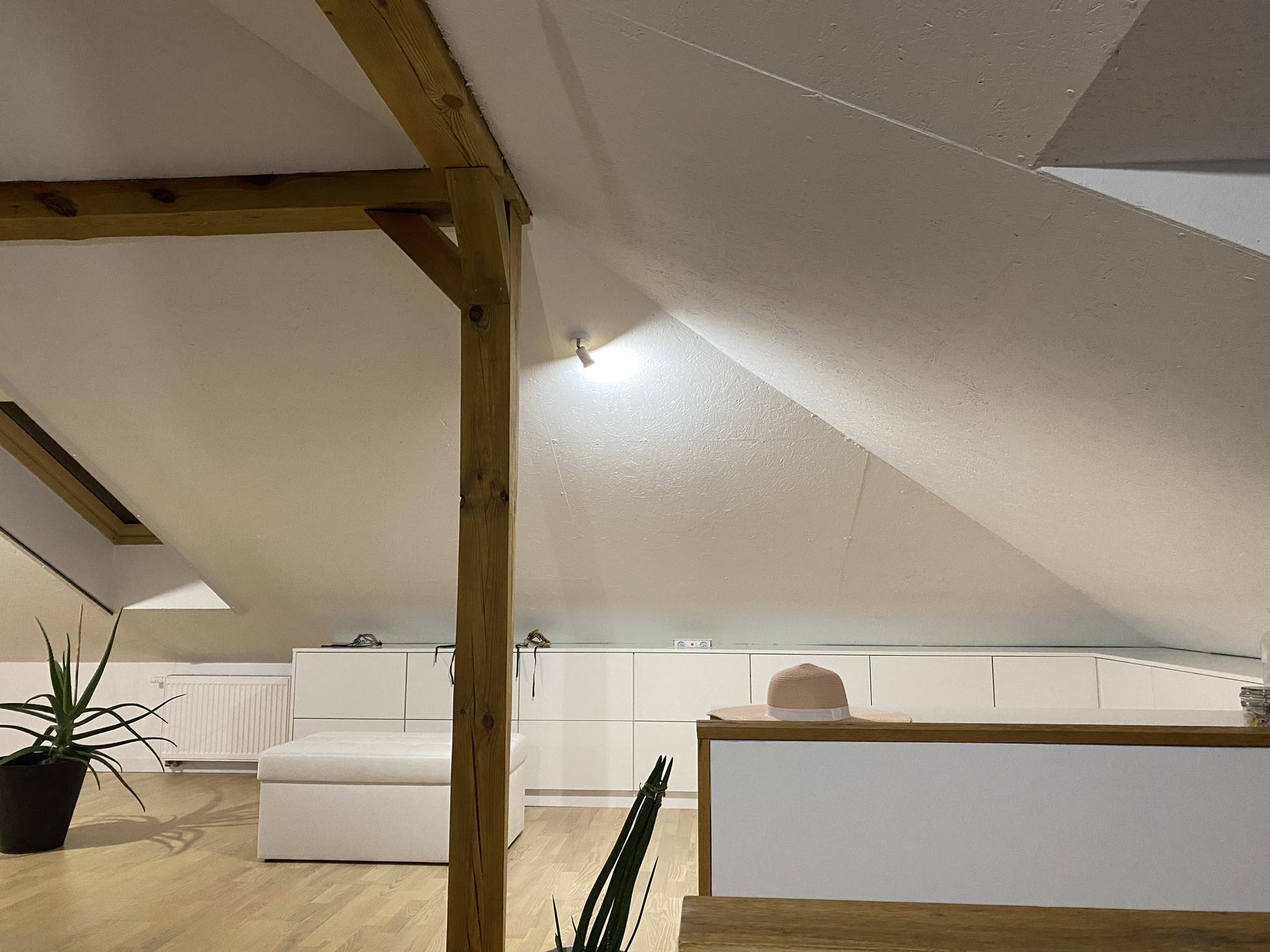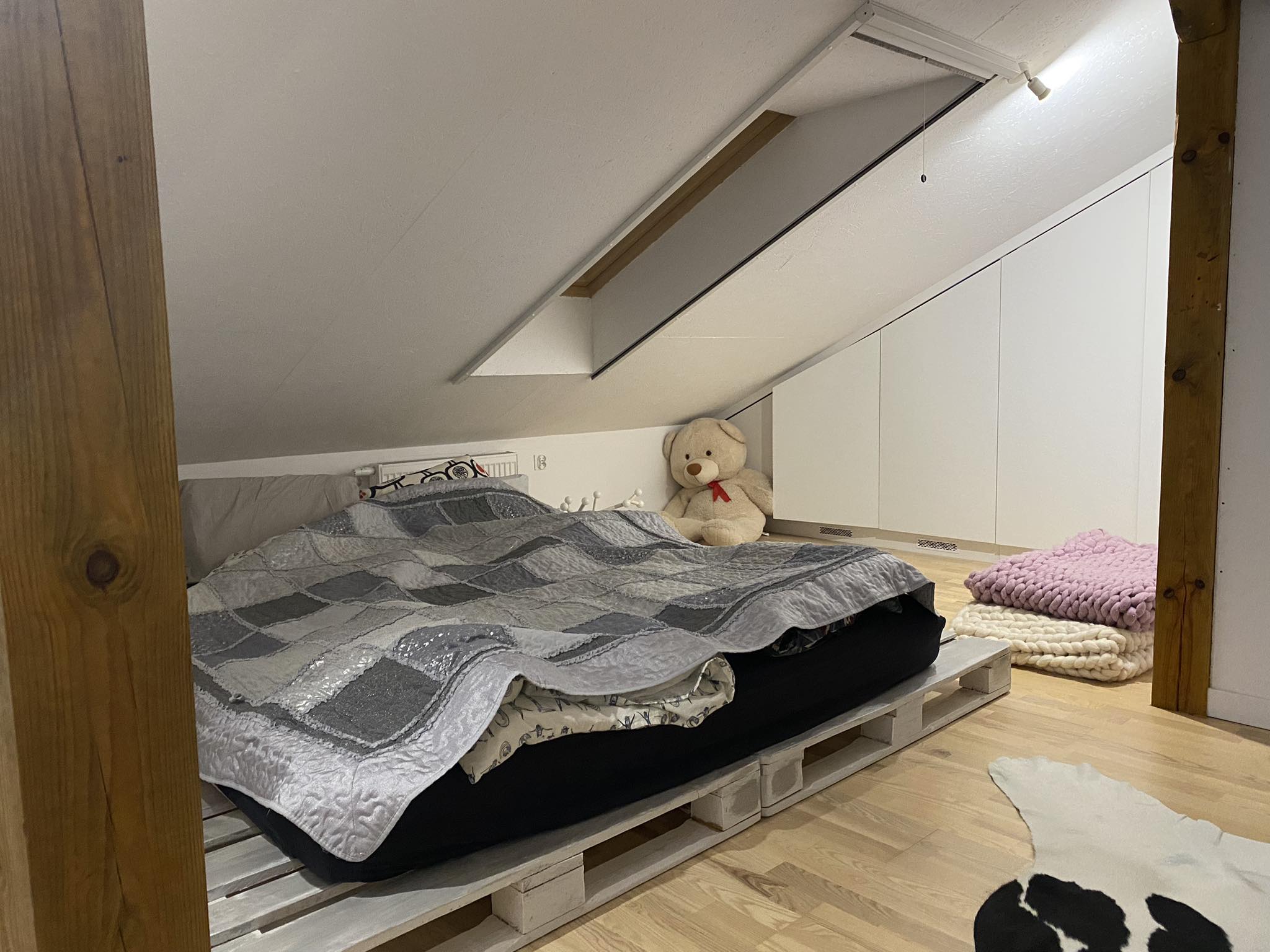 Wykorzystaliśmy je na szafy, są zarówno na wiszące ubrania jak i szuflady na cichy, buty i moja graciarnia. Ogólnie dzięki temu nie mamy żadnych szuflad ubraniowych piętro niżej. Kilka komód na książki oraz szpargały ale ogólnie cała góra wykorzystana na szafki. Na dole dzięki temu od razu wyburzyliśmy wnęki na szafy i otworzyliśmy salon i przedpokój. Znacznie to porpawiło jakość życia i optycznie zwiekszyło metraż dołu – 78 metrów.