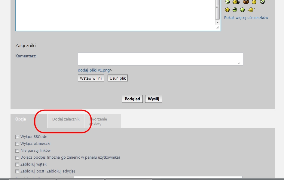 Aby dodać zdjęcie/plik należy po zredagowaniu naszego postu przejść do dolnej części okna przeglądarki.