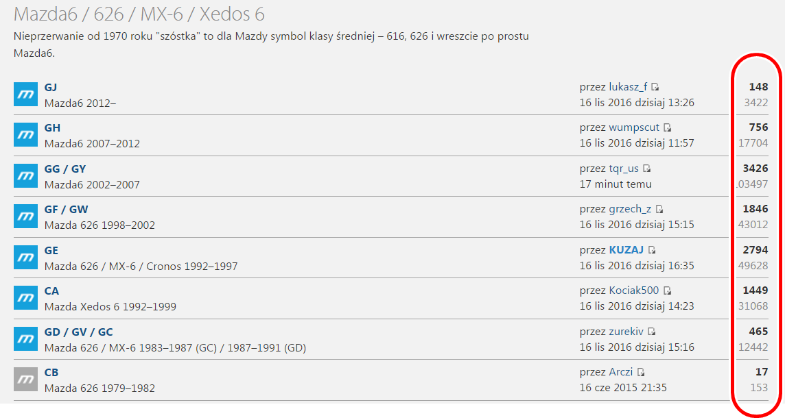 Trudno byłoby porównać aktywność w dziale "szóstek" do aktywności w dziale Miaty – to w dużej mierze zależy od popularności danego modelu. Świat idzie naprzód i obecnie nasi forumowicze nie są na tyle zdyscyplinowani, aby po usunięciu usterki dopisać do wątku rozwiązanie – często ten temat był podejmowany i nie doczekał się optymalnego rozwiązania
