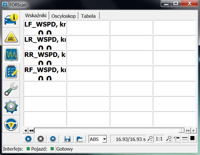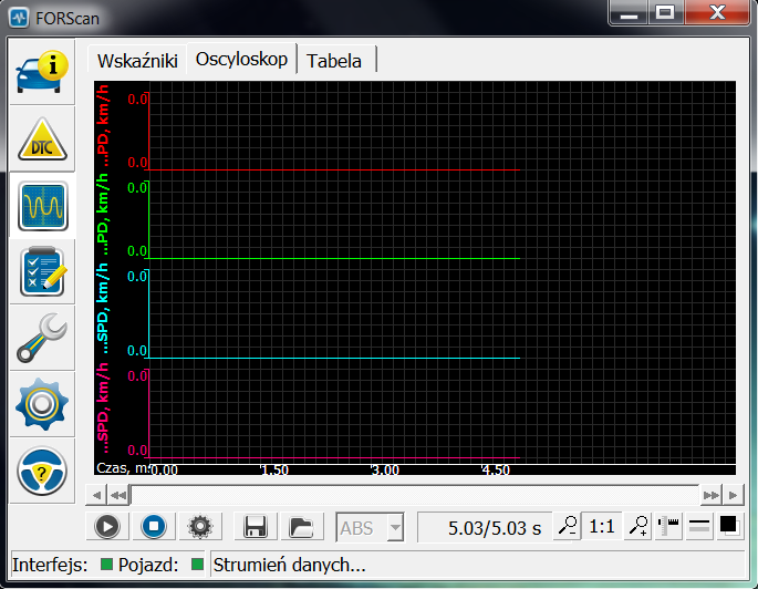 Okno PID. Tutaj mamy wgląd na odczyt aktualnych danych. Aby dane były odczytywane, musimy uruchomić odczyt klawiszem "play"