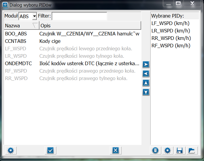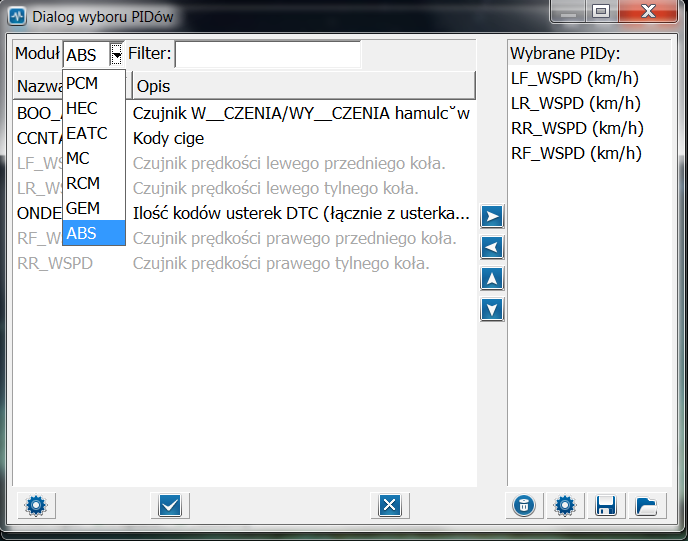 Lista PID które możemy podglądać. Moduł z którym jesteśmy aktualnie połączeni to ABS(więcej w kolejnym podpunkcie), "Filter" służy do wyszukiwania PID z tabelki.Duża tabelka z lewej to lista dostępnych PID, tableka z prawej to lista PID które wybraliśmy do podglądnięcia. Moduły dodajemy poprzez podwójne kliknięcie na dany PID. Jeśli jakiś PID już dodaliśmy do podglądnięcia, to w dużej tabelce po lewej ma szary kolor.