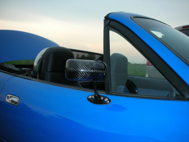 Fotele kubełkowe Sparco Pro2000, 4punktowe pasy bezpieczeństwa Sparco, Kierownica Nardi, quick release FET, kulowa gałka Sparco, lakierowany na czarny połysk kokpit, chromowane ringi wokół nawiewów, roll bar Mazdaspeed, pokrowiec na złożony dach, siatkowy windshot, Siedzenia i boczki – czarna skóra samochodowa i kopia alacantary, obszyte niebieska nicią. Polerka kilku gratów pod maską. Caraudio – jest ;)