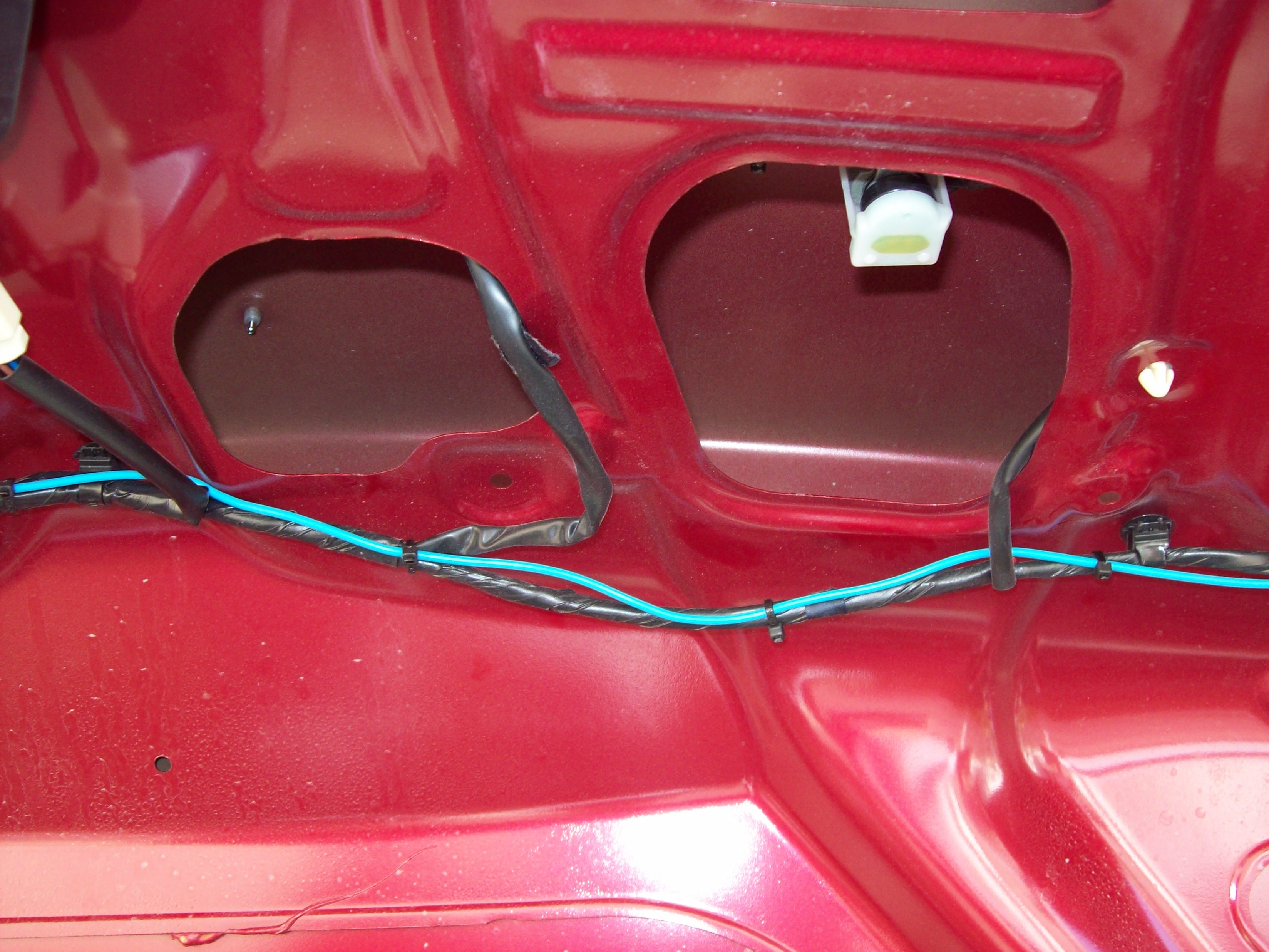 Przewód od manetki pociągnąłem pod listwami na podłodze od strony kierowcy – akurat nie trzeba nic rozbierać bo ładnie się schował. Trochę problemu miałem z przepchaniem przewodu w izolacji między klapą bagażnika a autem. Udało mi się od razu 3 szt przewodów przeciągnąć. Niby miały być dwa zapasowe ale na wykorzystanie jednego już mam pomysł więc zostanie tylko jeden na przyszłość :)