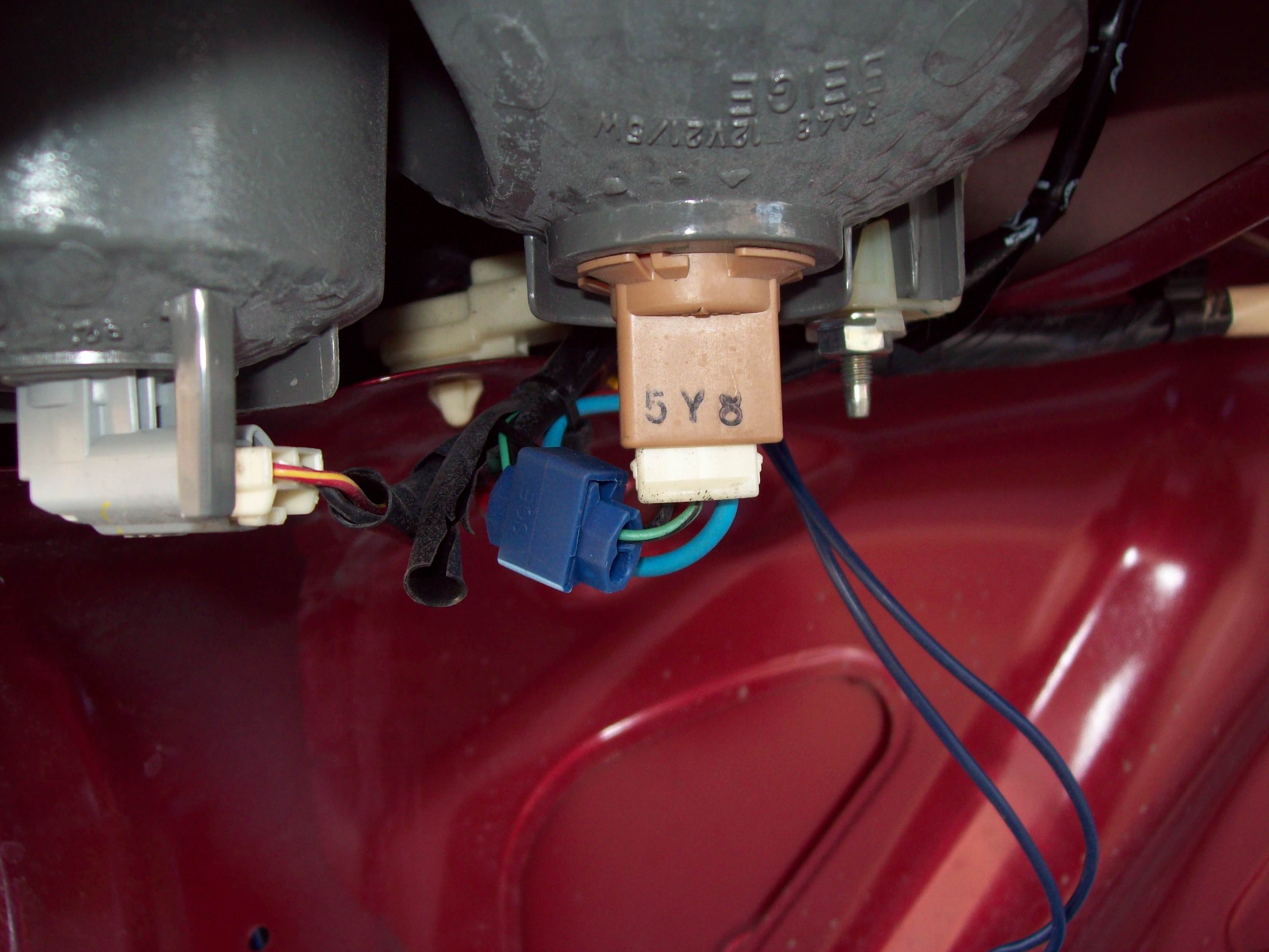 Kolejną rzeczą było wzięcie napięcia do świateł przeciwmgielnych. Tu mamy prostą sprawę ponieważ światła te mają się świecić wtedy gdy świeci się postój więc napięcie bierzemy z postoju. Ja zamiast ciąć i lutować podłączyłem się do przewodu za pomocą szybkozłączki (tej niebieskiej jak na fotce).