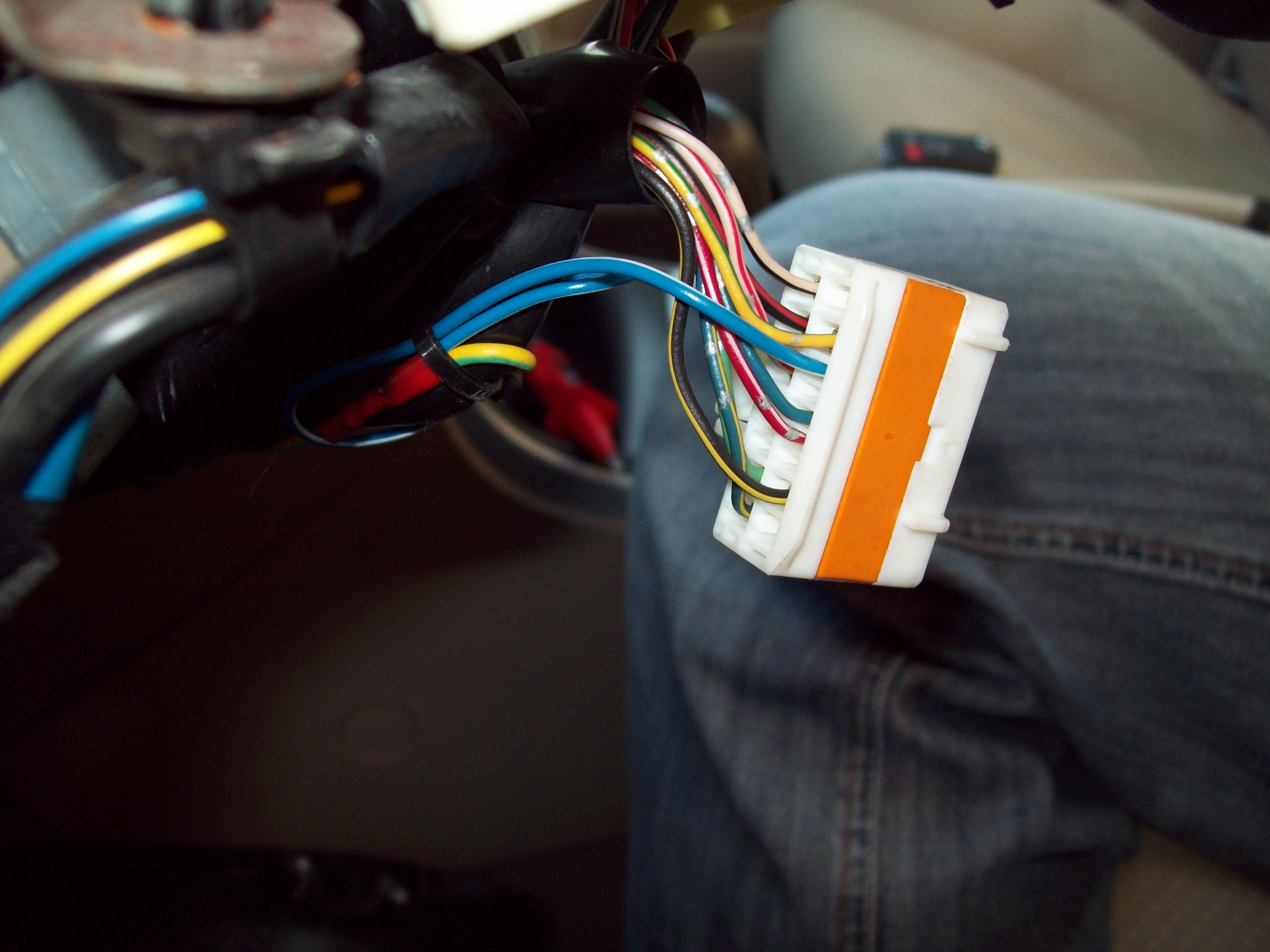 Następnie po dołożeniu pinów mocujemy nasz nowy przewód do tego fabrycznego, który idzie do lampy, żeby nam nie hałasował na dziurach. Można to zrobić taśmą izolacyjną lub opaskami samozaciskowymi – ja wybrałem to drugie ponieważ taśmy nie są już gatunkowo tak dobre i po paru zimach mało co z nich zostanie :). Zresztą więcej już tam zaglądać nie będziemy :)