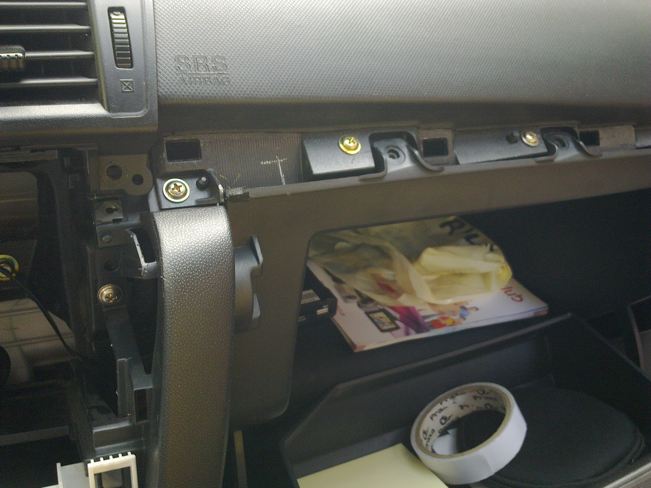 Dla lepszego dostępu odkręcamy i opuszczamy w dół schowek (dwie śrubki jak na zdjęciu, oraz po zatrzasku z każdej strony, w tym wypukleniu co się domyka schowek) oraz podnosimy plastik z nawiewami.