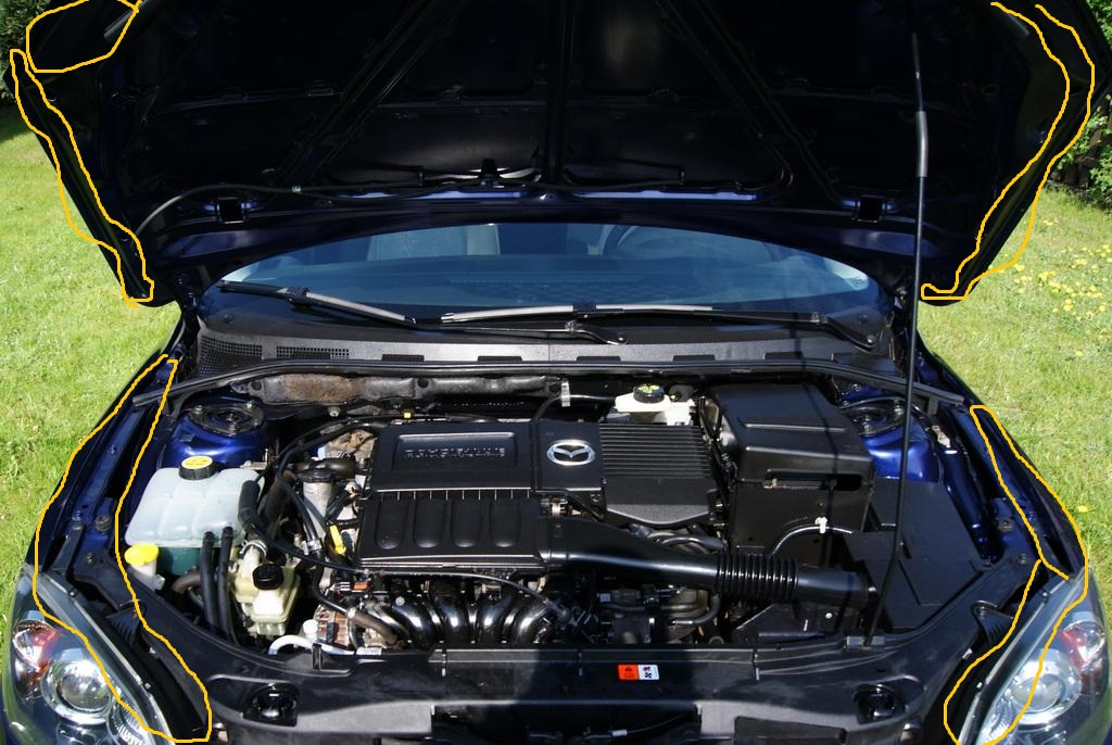 dzwoniłem do serwisu się zapytać i w dieslach były fabrycznie montowane a w benzynach nie. i facet mówił że są 3-4 uszczelki. 2 za reflektorami takie płaskie i jedna na masce i jedna na podszybiu. swoją drogą ta na podszybiu coś mi sie odkleja. czym sie klei i uszczelnia uszczelki? ja mam ochote dodać jeszcze po uszczelce w tym miejscu jak na załączonym obrazku. mam zamiar użyć zwykłej uszczelki samochodowej i uszczelnić te miejsca, bo uważam że tam dostaje sie powietrze i powstaje szum.