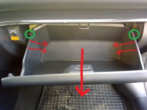 3. Teraz schowek trzyma się już tylko na bolcach i zawiasikach. Należy ścisnąć go oburącz jednocześnie przyciągając do siebie umożliwiając bolcom wyjście ze ścieżek pracy.