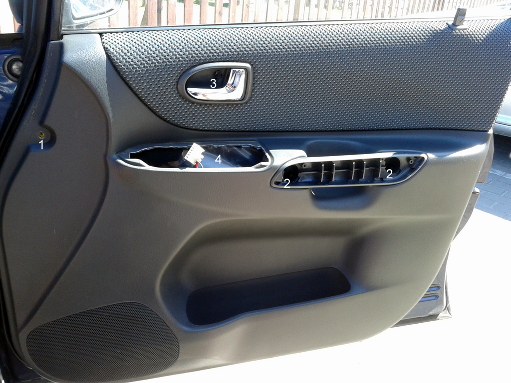 2-wkręty pod zaślepką podłokietnika,wsuwamy nożyk miedzy zaślepkę a uchwyt i już nam ładnie odczepia się