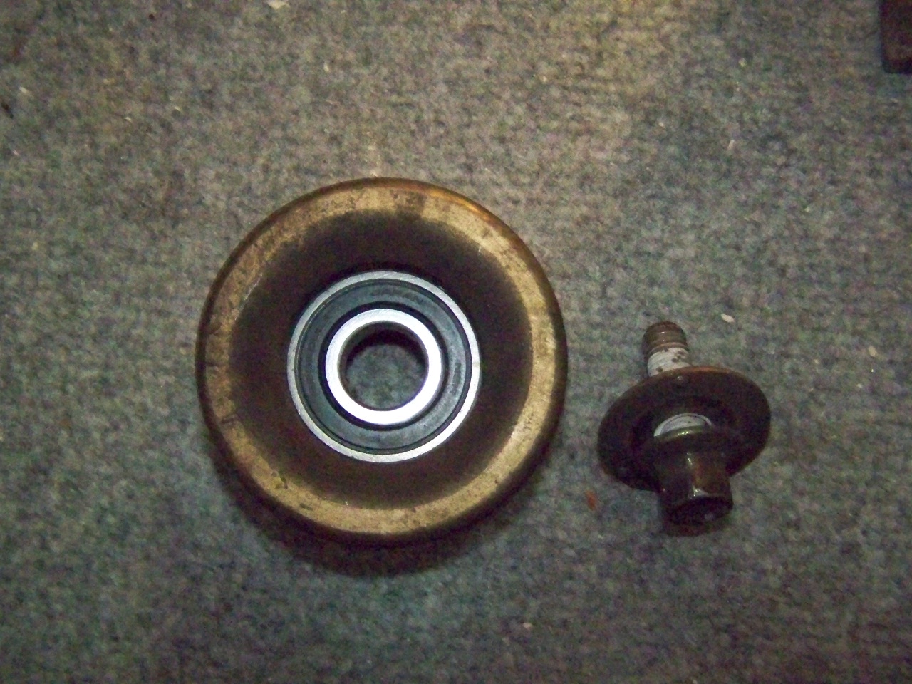 Klucz 14 i w drogę. Odkręcamy rolkę. Rolka schodzi – wewnątrz mamy jedno łożysko. To łożysko będzie ciężej wybić. U mnie nie miało luzu, ale chodziło bardzo ciężko. Podczas ściągania rolki może nam wypaść nakrętka z tyłu napinacza – spadnie na pokrywę silnika – będziemy musieli odkręcić dwie śruby od plastikowej pokrywy aby wyciągnąć nakrętkę.