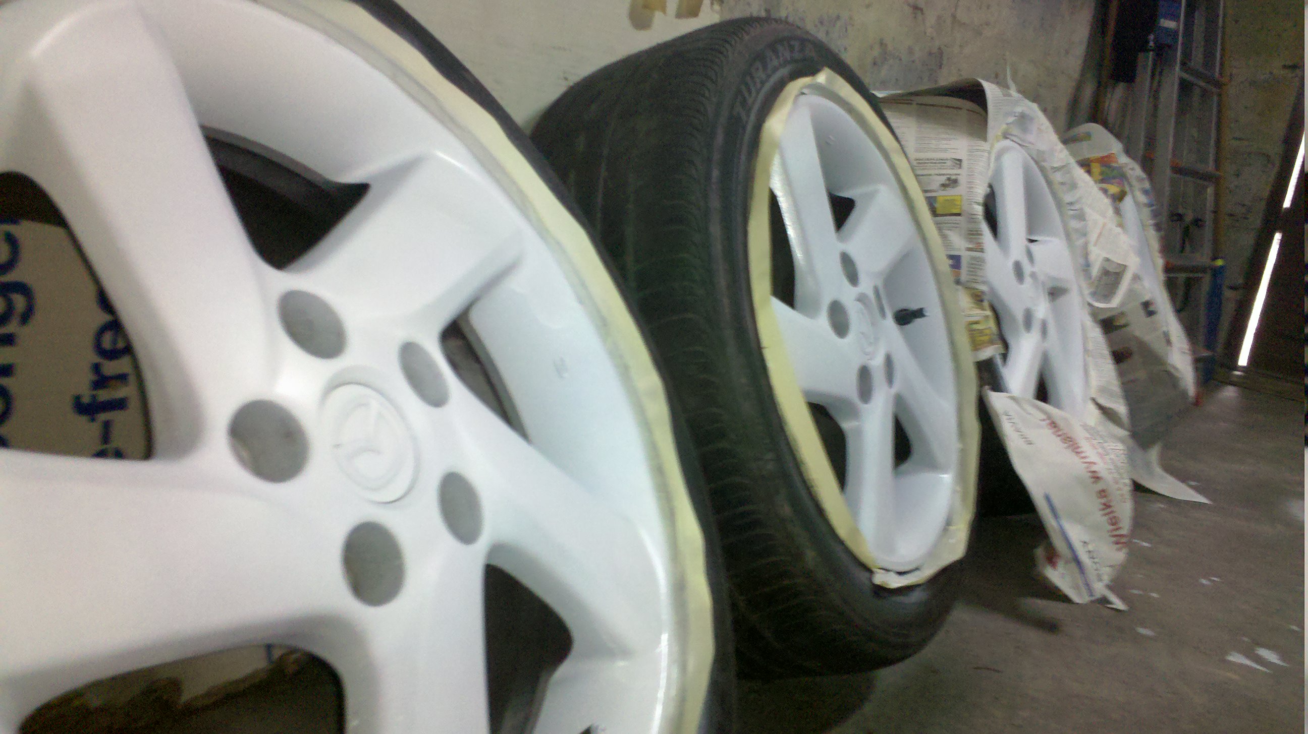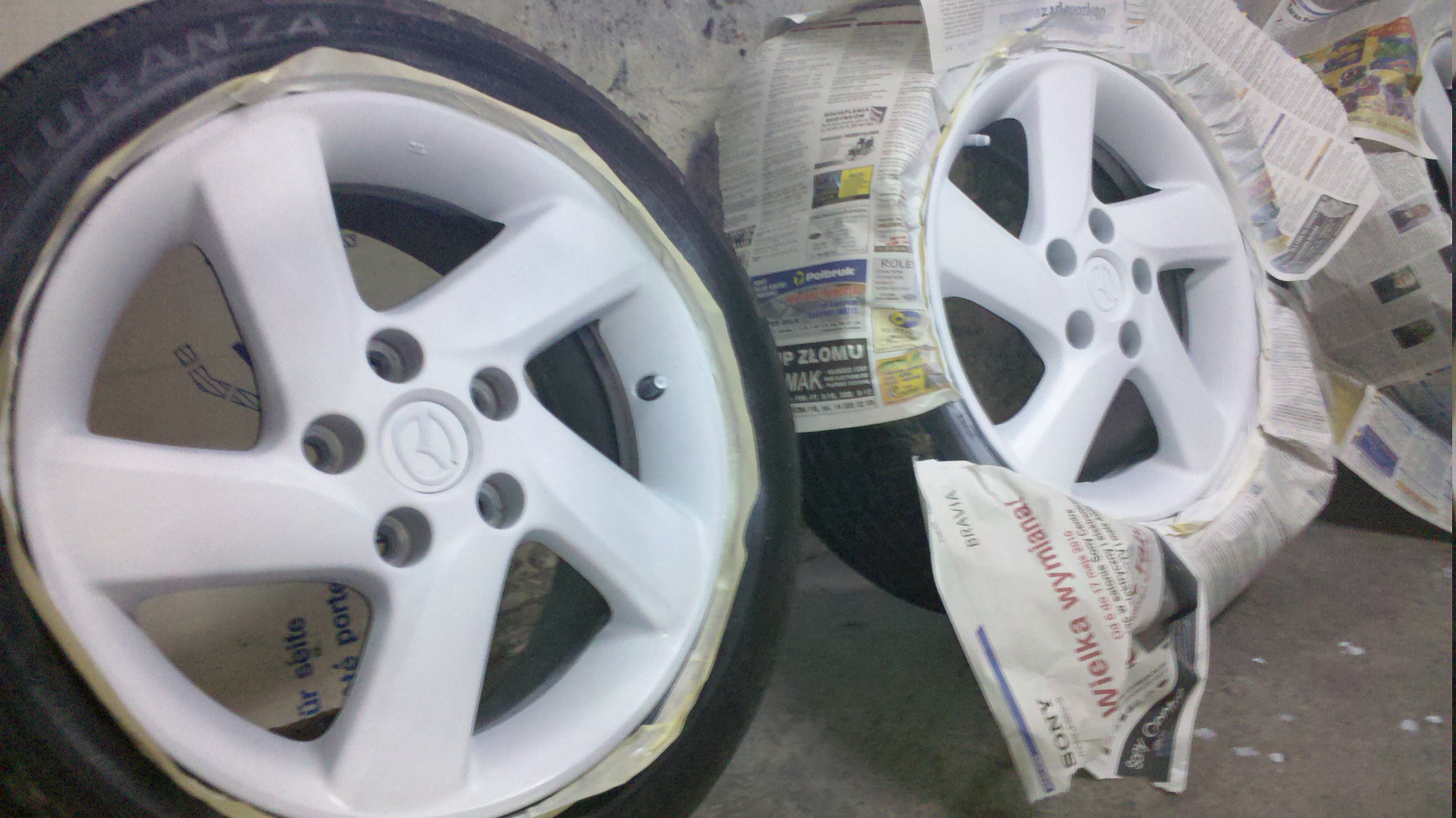 Blędem było malowanie felg nie załozonych na samochodzie (przy zakręcaniu nakrętek miejscami warstwa gumy przetarła się od klucza) ale trudno. Dla lepszego połozenia plastilaka przy krawędzi felga-opona,nie obklejał bym wspomnianej opony gdybym malował to kolejny raz.