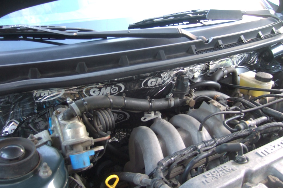 Na zdjęciach wydawać by się mogło, że wyklejenie grodzi i podszybia najpierw STP a potem GSMem to była łatwizna, ale w rzeczywistości, z przycinaniem i pasowaniem kawałków mat zajęło mi to dwa razy po kilka godzin. Niestety dostęp nie jest tak łatwy, a powierzchnia nie jest tak płaska, jak to widać na foto, i wymagało to trochę gimnastyki – podszybie ma trudny kształt, bo w pewnym miejscu (od serva hamulców po parownik gazu) blacha skręca pod kątem 90 stopni i jest ustawiona w poziomie na długość palców. Wyklejenie również tego fragmentu od spodu było najbardziej czasochłonne.
