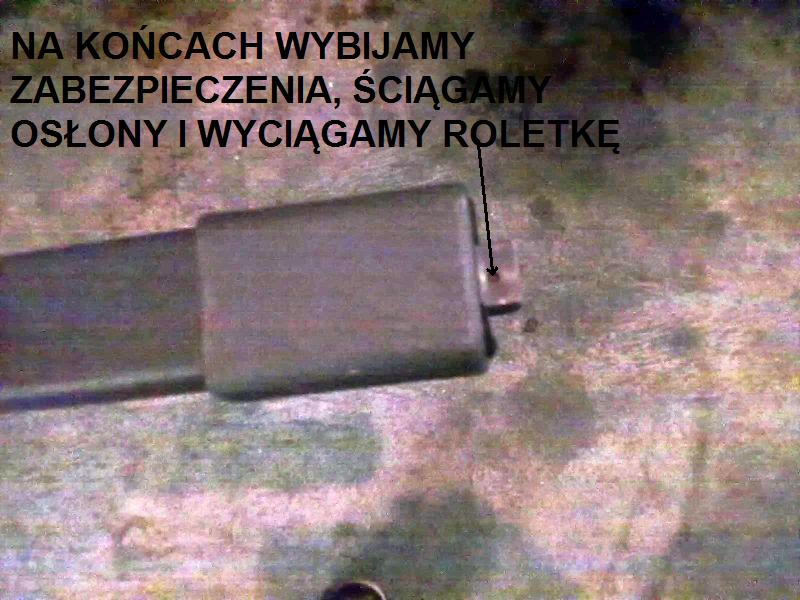 1- Po lewej i prawej stronie są plastikowe zakończenia z otworem. W tym otworze są małe bolce blokujące roletkę. Wybijamy je.