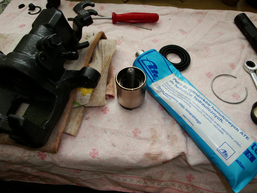 Od siebie mam dwie uwagi mianowicie, wypięcie zegara zwykłymi szczypcami nie sprawia większych problemów, natomiast jego wpięcie z powrotem w moim przypadku okazało się nie wykonalne. Problemem było doścignięcie go do dana tłoczka (standardowe szczypce są za grube) Dopiero zeszlifowanie szczypie (z oryginału została mniej więcej połowa) umożliwiło właściwie natychmiastowe załatwienie sprawy. Druga uwaga to pierścień stalowy przytrzymując gumową osłonę tłoczka jego rozmiar jest prawidłowy problem zakładki bierze się z tego że gumka układa się w nie właściwy sposób wewnątrz wyżłobienia. pierścień nie wchodzi w ostatni zwój gumki tylko na ten zwój i nie ma dość miejsca żeby właściwie się rozprężyć. Zauważyłem ze w tedy nie da się lekko przesuwać gumki na tłoczku.