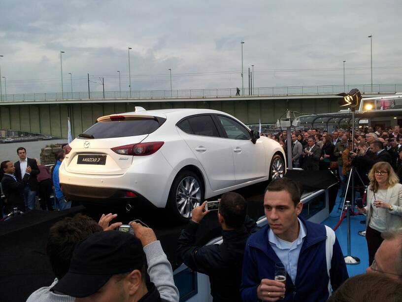 Wrzucam jeszcze trzy zdjęcia z telefonu z dzisiejszej demonstracji. Jutro wieczorem postaram się zgrać te, które mam w aparacie i napisać kilka słów pierwszych wrażeń. Na szybko mogę powiedzieć, że nowa "trójka" spelnila niełatwe oczekiwania. Styl ten sam, co w KE i GJ, ale detale mają swoj smaczek i samochód wygląda świeżo i jak na kompakt porywajaco. Wielki plus za nowe wnętrze i system multimedialny. Silniki na poczatek niestety bez sensownego na polskie warunki Diesla – benzynowe 1.5 i 2.0 o mocach 100, 120 i 165 KM, oraz 2.2d 150 KM. Patrząc na nią od razu czuję się, ze może być to bestseller, który pobije wyniki sprzedaży BK i dzieki któremu Mazda – juz jako samodzielna firma – powroci na szczyt. Dobra robota – nie schrzanili tego ;).