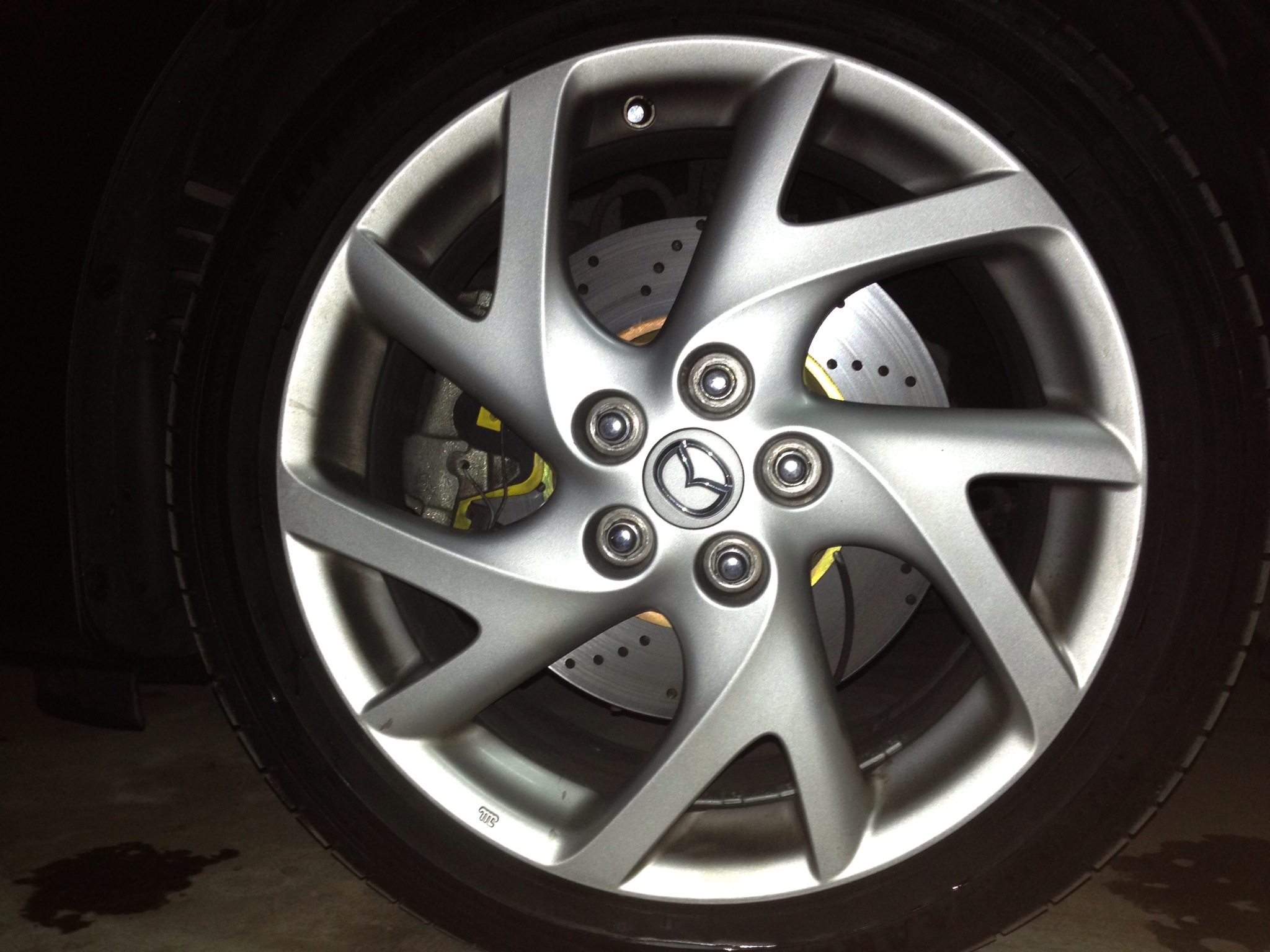 Jak się tylko zaczęło robić ciepło czyli +20 tarcze ebc tg i green stuffy przestały się wyrabiać. Zestaw zaczął się grzać straszliwie, do tego stopnia, że kierownica biła po kilku hamowaniach w trasie ze 140 do 80, jak się schłodziły było ok. Natomiast zauważyłem że po każdym kolejnym przegrzaniu zaczynają dostawać temperatury coraz szybciej i po pewnym czasie nawet w mieście był problem. Rozmawiałem z EBC – reklamować można ale marne szanse żeby angole cokolwiek uznali. Zacząłem więc szukać jakiegoś lepszego rozwiązania. Przekopując dalej internet znalazłem info że chłopaki z mazvagtech znaleźli rozwiązanie – zaciski z mazdy 6 gg 2,3 turbo mps pasują plug and play do mojej Madzi. Przekładka zacisków pozwala na włożenie 320 mm tarczy (standard 299mm) i dużo większego klocka. Felga przy takim zestawie to minimum 17".