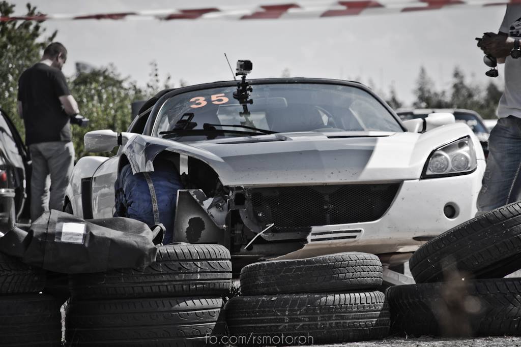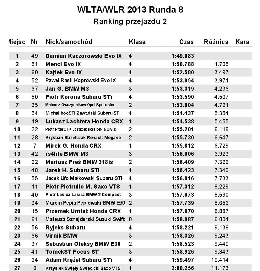 Dzisiaj już po 8 edycji WLTA. Przejazd zapoznawczy ok, wiedziałem że będę musiał uważać na nie rozgrzane slicki bo niechciały kleić. Nie było w ogóle miejsca na grzanie opon, więc startowałem na pierwszym na zimnych slickach. 1 kółko zachowawczo i w miare spokojnie, na drugim na szykanie prędkość około 110-120 slick trzyma trzyma i nagle puszcza auto leci na wprost na 4 opony spięte razem, odbiłem się widziałem tylko w lusterku jak lampa na 3m w górę leci, a reszta kawałków samochodu po bokach <płacze> Zatrzymałem się pozbierałem graty, na szczęście lampa cała jedynie porysowana do spolerowania. Na pierwszym przejeździe załamka już miałem auto ładować na lawetę. Jednak podchodzi kumpel i mówi, że mam jechać dalej on ma koce grzewcze i rozgrzeje mi przód do 80 stopni <diabełek> Jeszcze paru innych namawiało do dalszych startów, no i poszło. Wyników nie będę komentować sami zobaczycie. Powiem tylko jedno, jak to auto dostanie nagrzanego slicka to potrafi z fotela wyrzucić na zakręcie <faja>. Ogólnie jestem zadowolony. Auto jest już u lakiernika na kolejne zawody w październiku mam mieć gotowe <głaszcze>