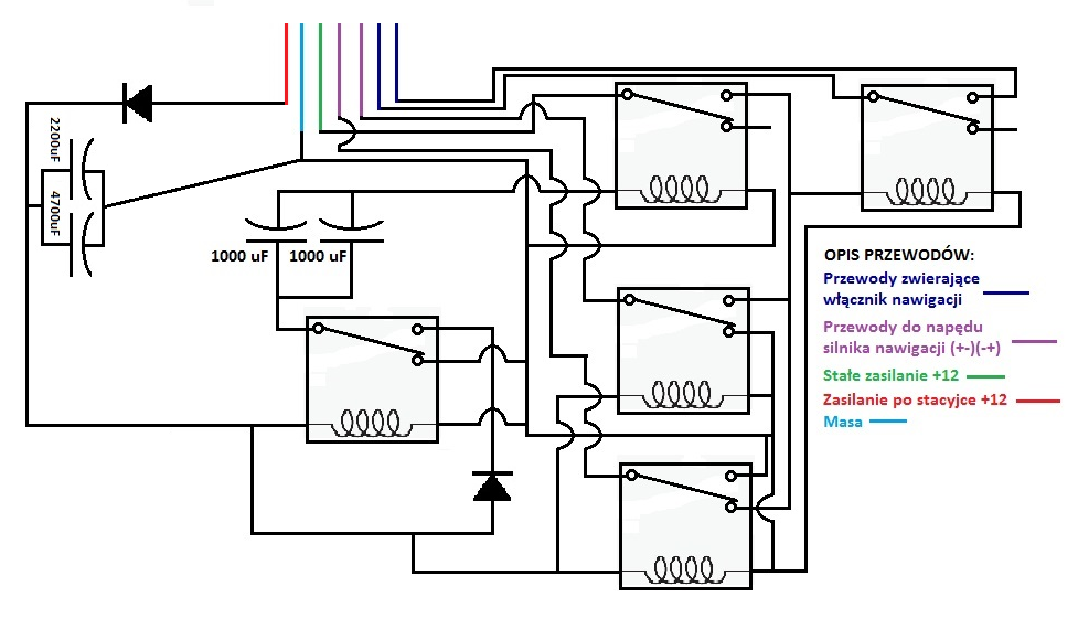 A no i przy okazji od razu wspomnę że jest jeden szkopuł w moim podłączeniu ponieważ układ taki jak na schemacie działa tak że gdy podamy zasilanie na przewód (po stacyjce) nawigacja się otwiera a po zaniku zasilania zamyka i tu miałem problem ponieważ przewód po stacyjce podłączyłem pod zapalniczkę a podczas uruchamiania silnika zasilanie w zapalniczce na chwilę zanika a więc i nawigacja w tym momencie się zamykała a po chwili otwierała. Rozwiązanie tego problemu to albo znaleźć przewód na którym po przekręceniu kluczyka pojawia się zasilanie i nie znika podczas uruchamiania silnika albo rozwiązać to za pomocą przekaźnika z podtrzymaniem czyli w cewkę przekaźnika wpiąłem dwa kondensatory równolegle jeden 4700uF drugi 2200uF do tego oczywiście diodę na plusie i taki przekaźnik podtrzyma nam prąd ok 7-8 sek więc spokojnie w tym czasie zdążymy odpalić auto ;) . U siebie zastosowałem drugą opcję bo nie chciało mi się grzebać w przewodach :P . Po za tym testuję nawigację już ponad dwa tygodnie i więcej wad nie znalazłem :D