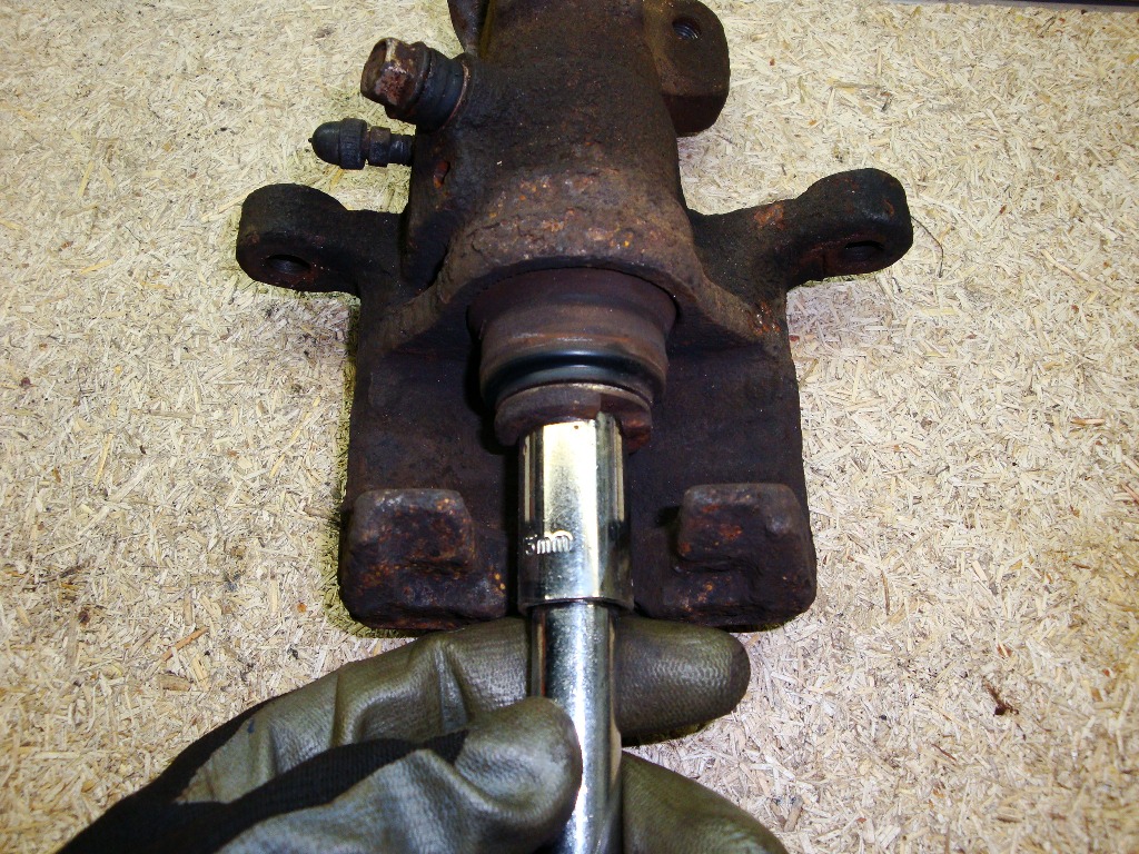 Tłoczki wykręcamy. Istnieją specjalne zestawy kluczy z zapierakami ale trochę kosztują. Postanowiłem wykonać taki klucz ze zużytej nasadki 13-tki. 10min pracy na szlifierce, kwadrans z iglakiem i klucz był gotowy.