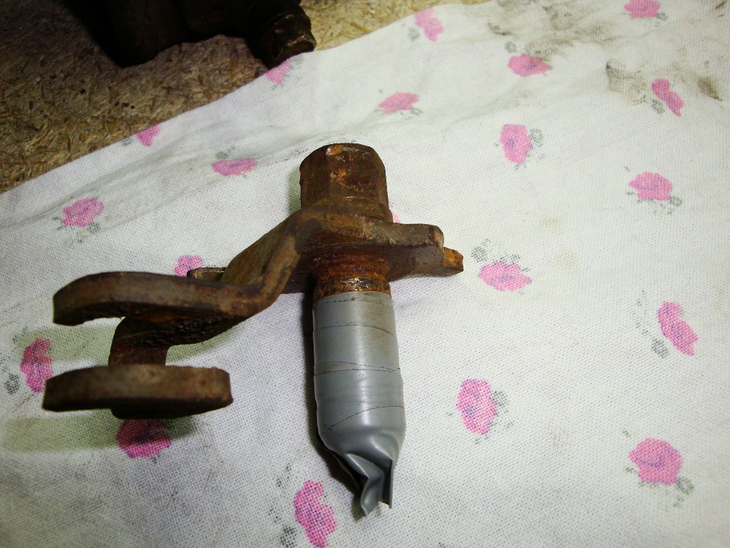 Przyczyną przedsięwzięcia było zatarcie prowadnicy prawego hamulca. Miałem duży problem ze zdemontowaniem, bo dolna prowadnica była tak zapieczona, że nawet po odkręceniu górnej musiałem używać młotka i przecinaka, żeby odchylić zacisk w jarzmie. Pół godziny zmagań z użyciem środków penetrujących i dolna prowadnica poddała się. Po oględzinach okazało się, że łby śrub jak i same prowadnice noszą ślady poprzednich interwencji a gniazda są wypełnione korozją, zamiast smarem.