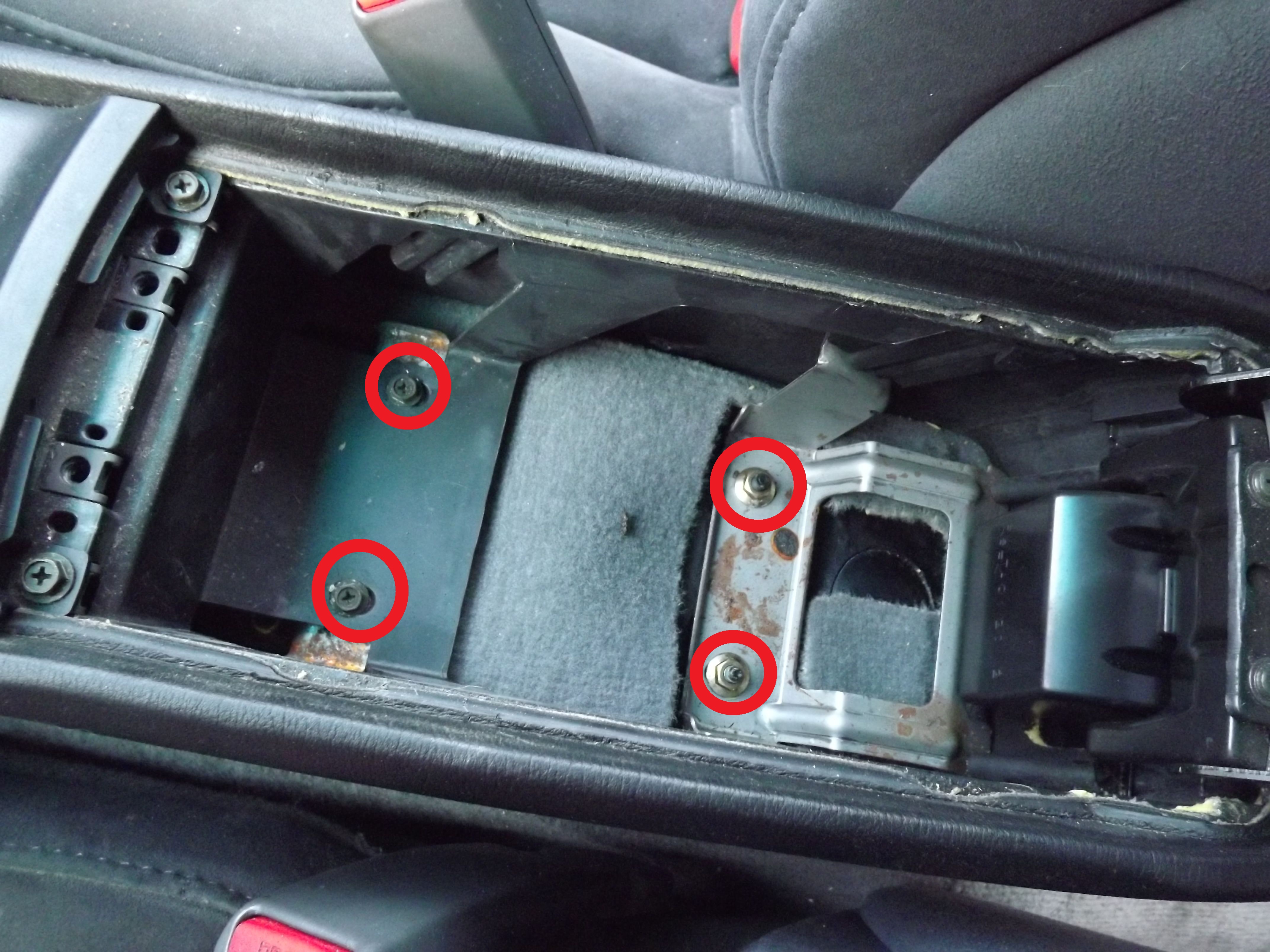 Jeżeli ktoś chce demontować cały tunel środkowy będzie musiał odkręcić zaznaczone na czerwono śrubki, czyli 2x klucz 10 oraz 2x krzyżak.