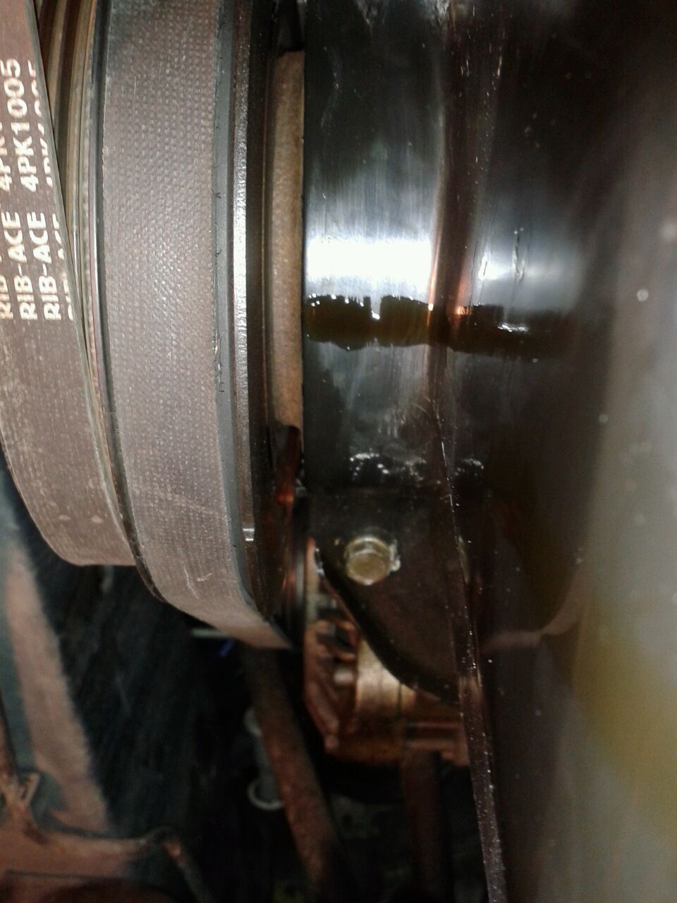 Ja z kolei mając ten sam silnik co luqas mam również wyciek oleju, który pokazał się na obudowie misy olejowej pod kołem pasowym wału (foto). Przypuszczam, że to zimering na wale. W związku z tym mam pytanie – jak dobrać się do jego wymiany? trzeba ściągać misę, czy wystarczy dostać się tam od strony rozrządu? Sprawa zrobiła się pilna, bo wymieniając olej zauważyłem plamę na wahaczu (w sumie to cały był z oleju) i podłodze auta aż do jego połowy, więc wyciek – szczególnie przy rozgrzanym oleju i szybszej jeździe wywołuje plamę na znacznej powierzchni podwozia. Ale zasadniczo jakoś go nie ubywa w zastraszającym tempie.