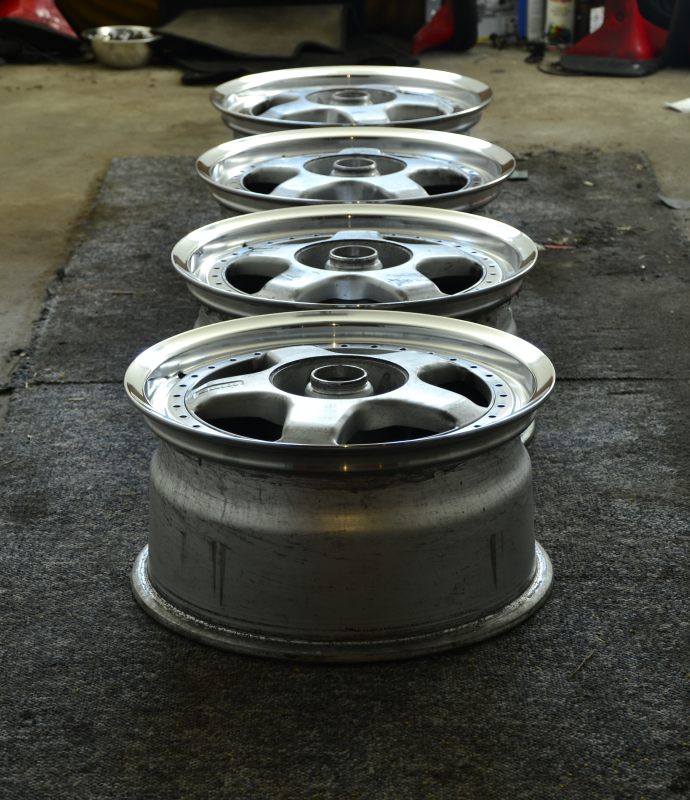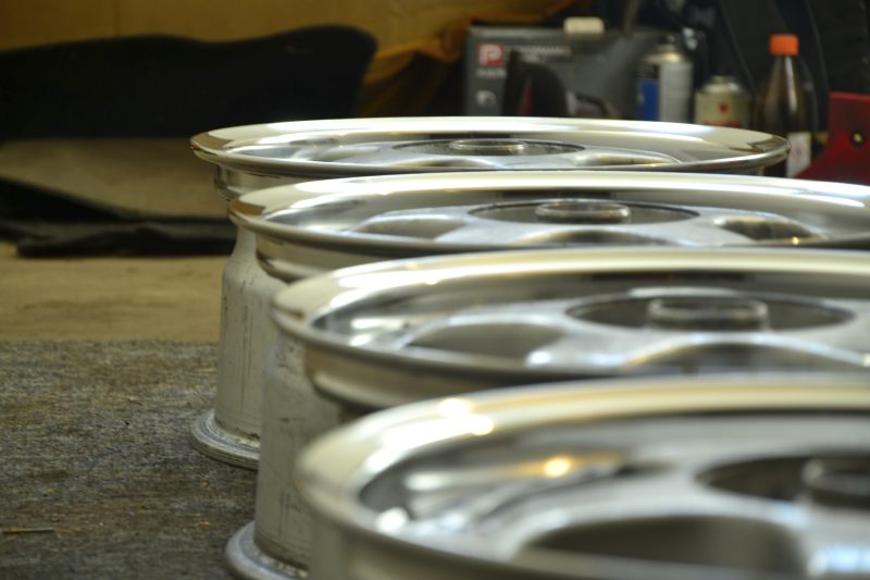 Przedni zderzak zamarzył mi się bez wnęki na tablicę i jest. Ranty felg wstępnie wypolerowane. Same felgi rozkręcone, rotory i bębny oddane do piaskowanka. W międzyczasie przyszły opony – będzie all around 185/35 na 8,5