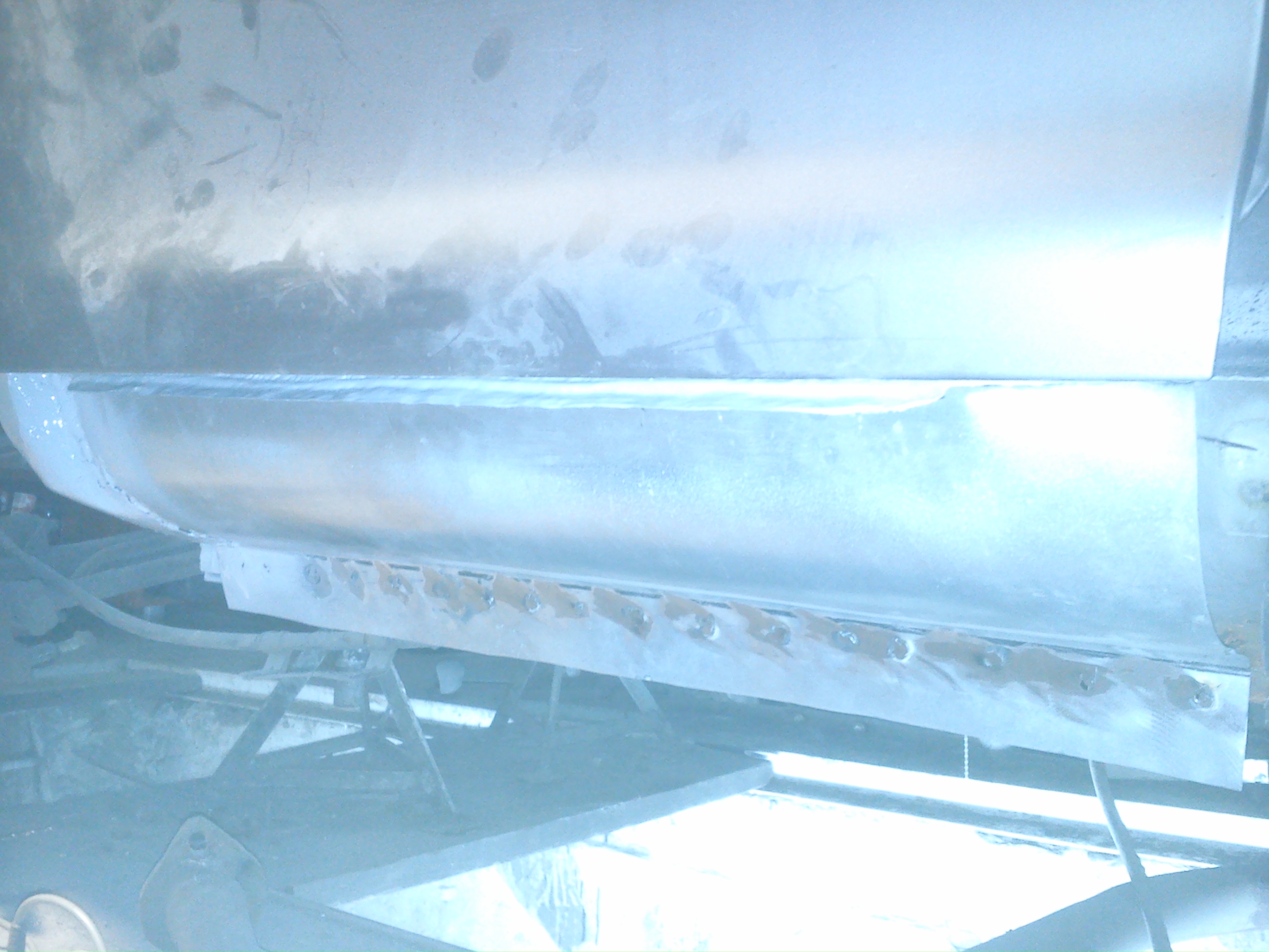 że będzie gorzej niż z prawej, trochę się zdziwiłem bo blacha wewnętrzna progu jest skorodowana ale ma się całkiem dobrze i myślę że spokojnie mógłbym na niej samochód podnieść, podłużnica poza jedną dziurą też całkiem w porządku wygląda.
