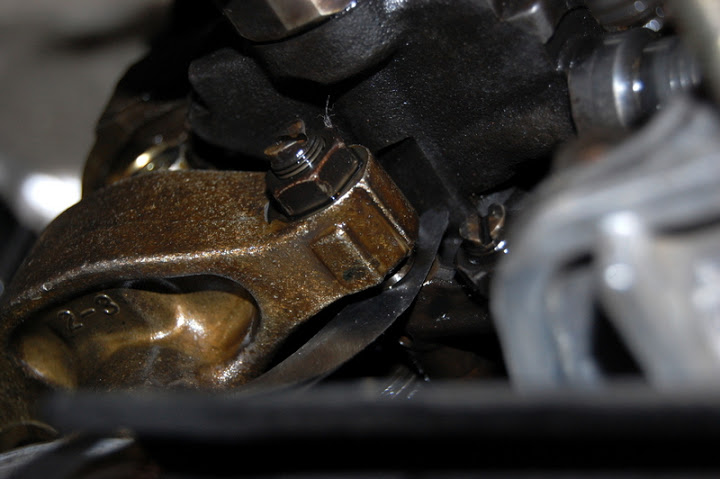 później popuszczamy nakrętkę 2 i kręcąc śrubą 1 możemy zmniejszyć lub zwiększyć luz pomiędzy kowadełkiem a dźwigienką. Kręcimy tak, aby szczelinomierz nam w miarę mógł się poruszać, po czym dokręcamy lekko nakrętkę. Z doświadczenia mogę zasugerować nieco ciaśniejsze ustawienie śruby 1, tak aby szczelinomierz miał opory przy ruszaniu się, bo przy właściwym dokręcaniu nakrętki jeszcze nam się lekko luz może zwiększyć.