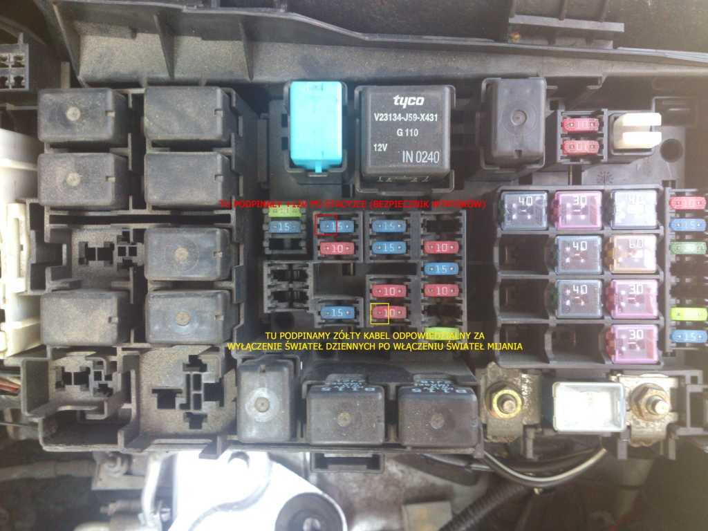 -następnie z drugiej strony modułu mamy kable czerwony(+ po stacyjce), czarny(masa), żółty(sygnał z światła mijania). Podpinamy + do bezpiecznika od wtrysków, masa do karoserii auta lub do akumulatora jak wolisz i teraz żółty do bezpiecznika świateł mijania. Pamiętaj aby na + zamontować oprawkę na bezpiecznik, 10A wystarczy.