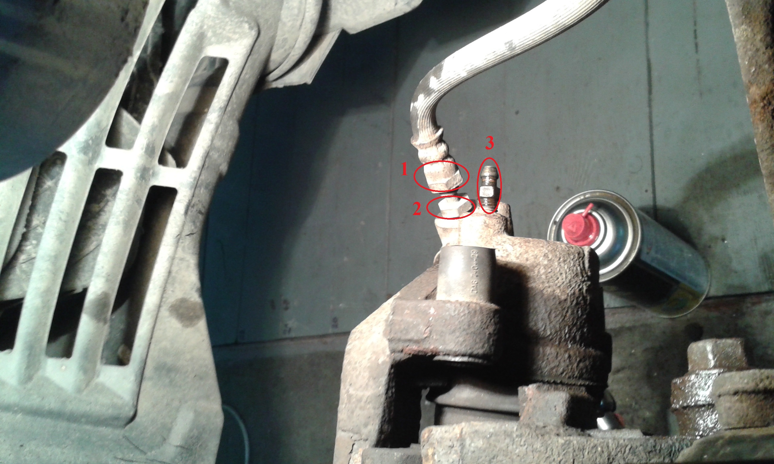 Bierzemy 2 klucze płaskie 13 i 14 oraz coś aby zatkać przewód hamulcowy . Mniejszym 13 przytrzymujemy nakrętkę oznaczoną nr.2 i odkręcamy końcówkę na zacisku do którego jest podłączony przewód ,większym kluczem przytrzymujemy przewód w miejscu nr.1 ,aby się nie ukręcił.