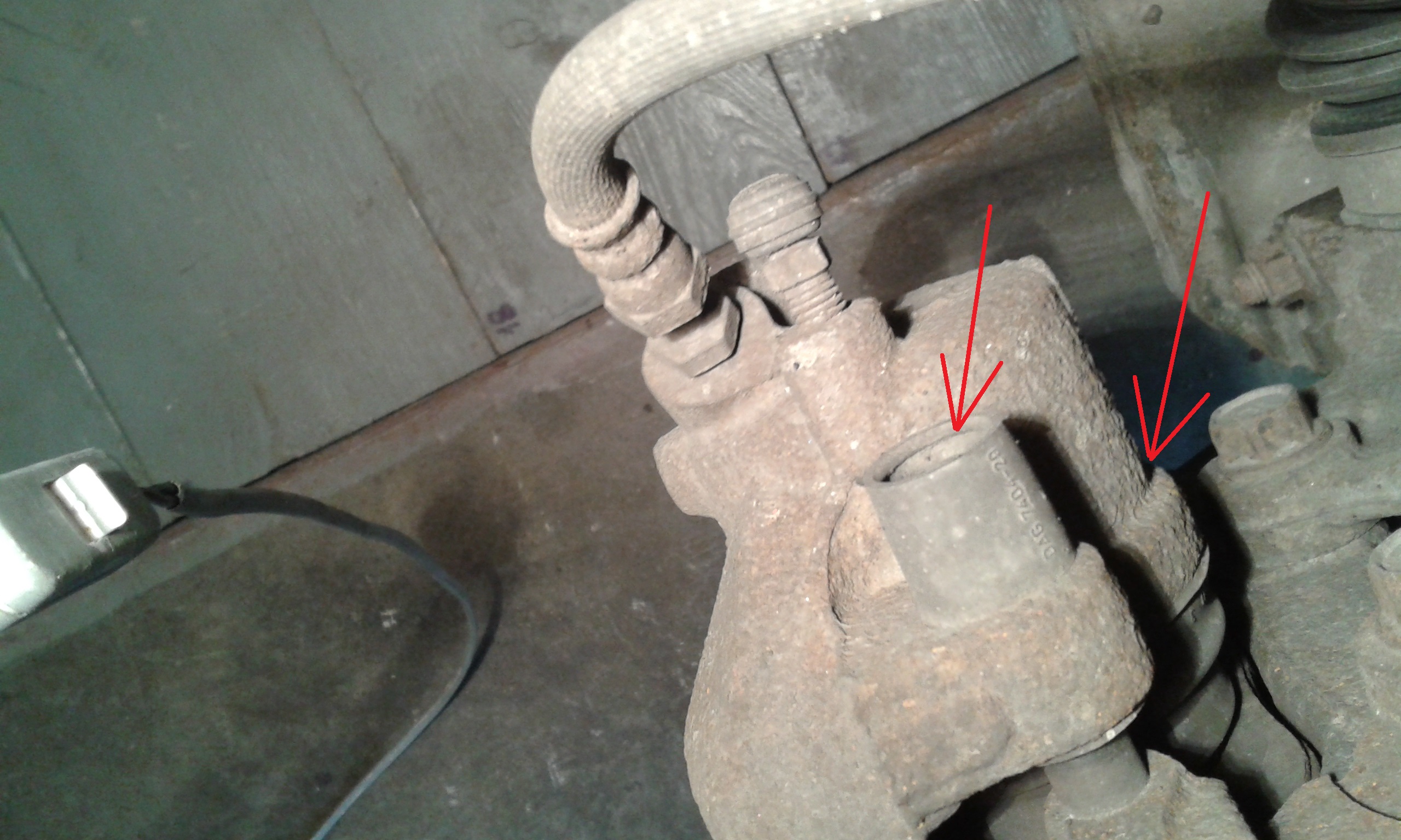 3. Gdy już uporamy się z przewodami. Bierzemy do ręki nasadkę imbus 7 oraz klucz nasadkowy 10, grzechotkę i wykręcamy 2 tłoczki prowadzące. Zaznaczone poniżej. Następnie zdejmujemy zacisk z tłoczkiem.