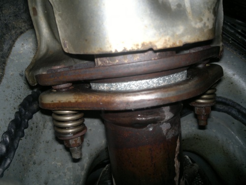 3. Postanowiłem nie robić połączenia stałego tylko jak fabryka dała ze sprężynami, więc pierwsze spryskałem śruby moimi odrdzewiaczami cola + wd40 (żeby ich od razu nie ukręcić). Następnie obstukałem młotkie i przedłużką od grzechotki. Chodzi oczywiście o te śruby zaznaczone na czerwono